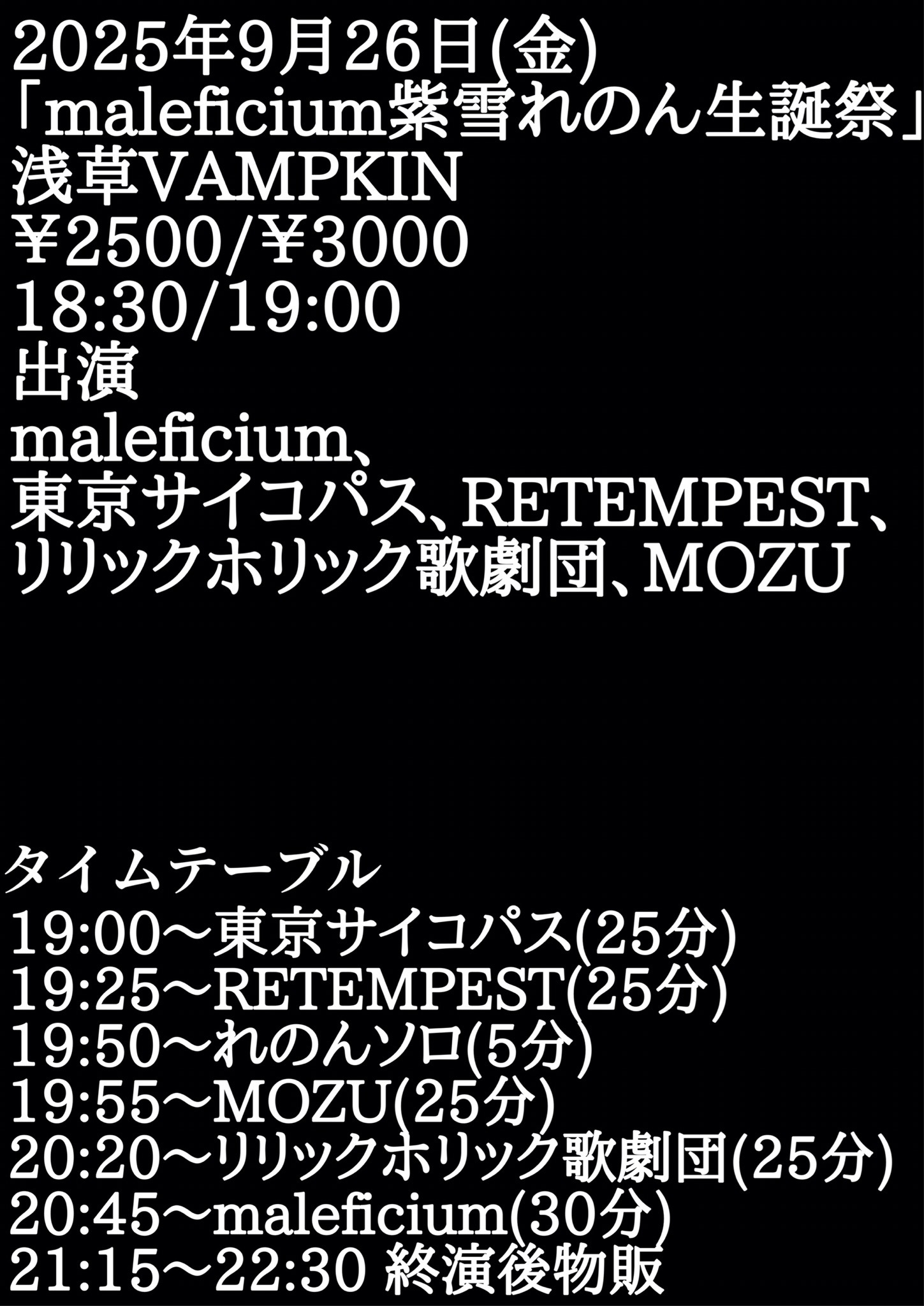 浅草 VAMPKIN スケジュール 2025.9.26(Fri) maleficium紫雪れのん生誕祭 [ACT] maleficium、東京サイコパス、RETEMPEST、リリックホリック歌劇団、MØZU [OPEN/START] 18:30/19:00 [料金] ¥2500/¥3000