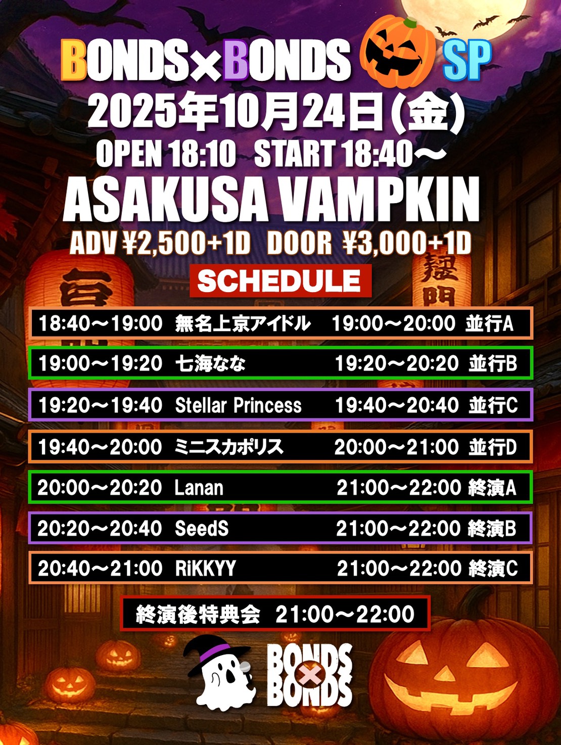 浅草 VAMPKIN スケジュール 2025.10.24(Fri) BONDS×BONDS ハロウィンSP [ACT] SeedS RiKKYY Lanan ミニスカポリス 無名上京アイドル Stellar Princess 七海なな [OPEN/START] OPEN 18:10 START 18:40 [料金] 前売 ¥2,500 +1D 当日 ¥3,000+1D https://tiget.net/events/429324