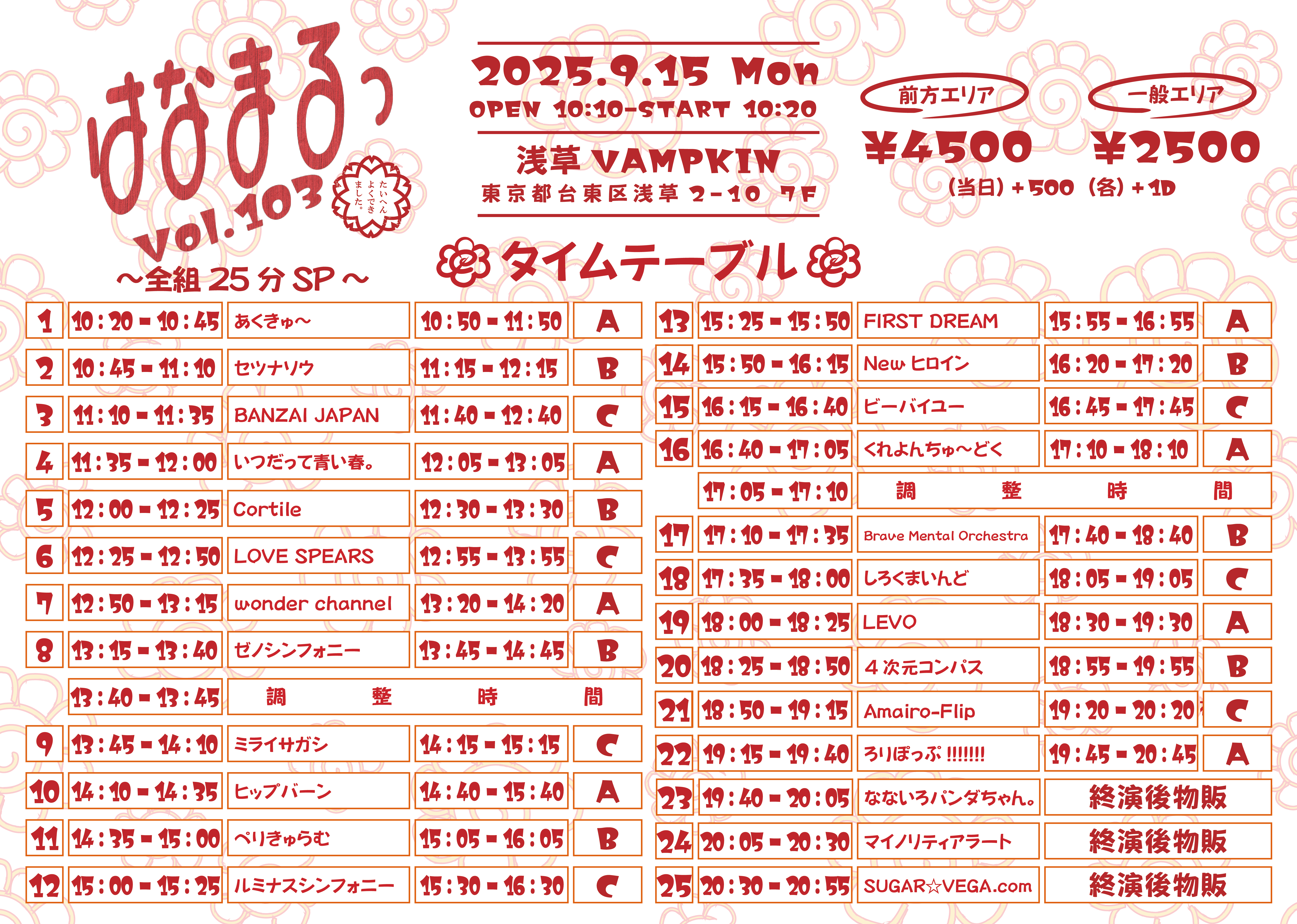 - BANZAI JAPAN/LOVE SPEARS/くれよんちゅ~どく/4次元コンパス/マイノリティアラート/SUGAR☆VEGA.com/ビーバイユー/ヒップバーン/Brave Mental Orchestra//いつだって青い春。/wonder channel/ろりぽっぷ!!!!!!!/Cortile/ミライサガシ/ゼノシンフォニー/Newヒロイン/Amairo-Flip/あくきゅ~/FIRST DREAM/セツナソウ/なないろパンダちゃん。/ぺりきゅらむ/LEVO/ルミナスシンフォニー/しろくまいんど