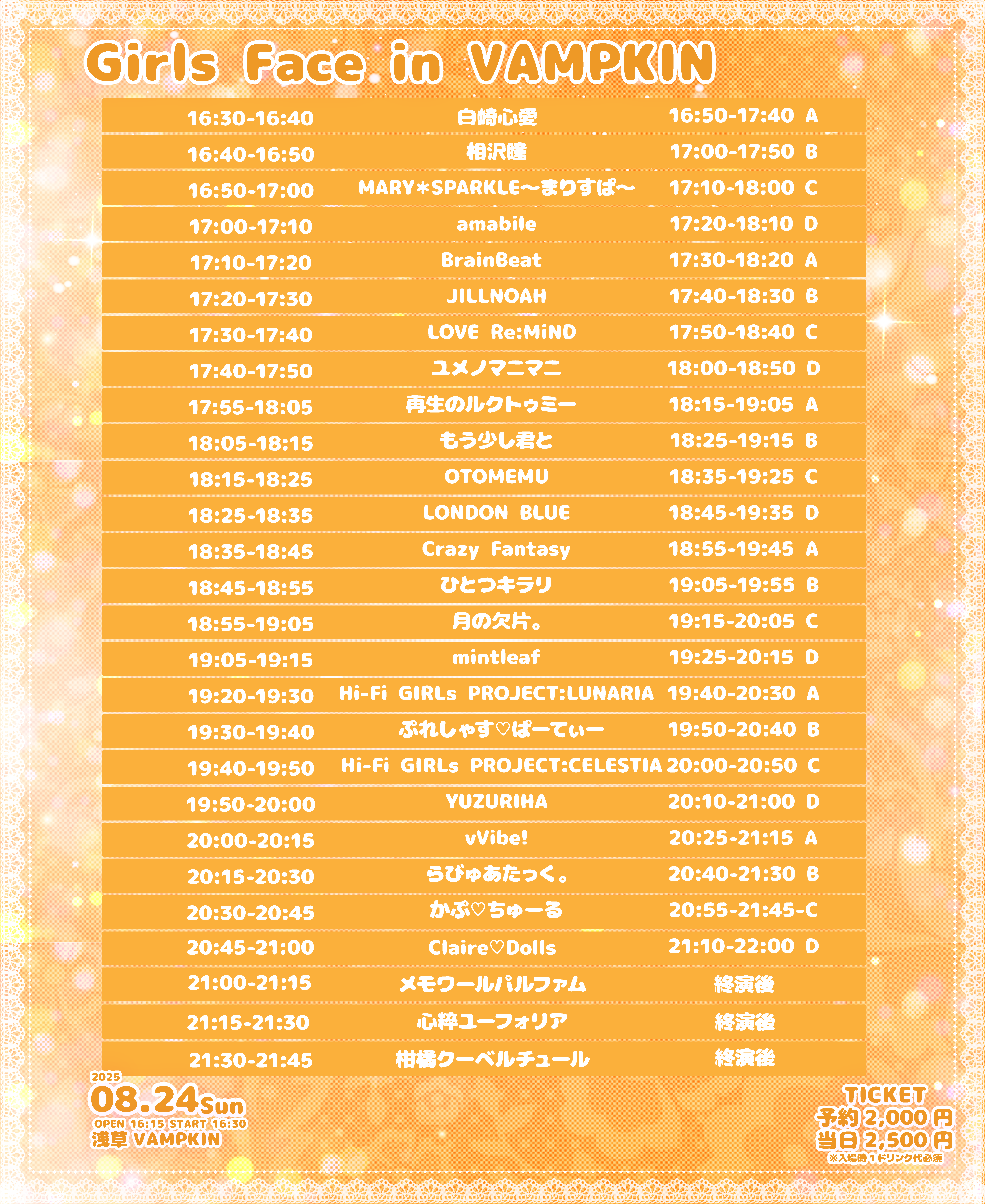 - かぷ♡ちゅーる/ 柑橘クーベルチュール / Claire♡Dolls / vVibe / メモワールパルファム / らびゅあたっく。 / YUZURIHA / 月の欠片。 / ひとつキラリ / 心粹ユーフォリア / mintleaf / もう少し君と/ Crazy Fantasy / LONDON BLUE / LOVE Re:MiND / JILLNOAH / amabile / Hi-Fi GIRLs PROJECT:LUNARIA / Hi-Fi GIRLs PROJECT:CELESTIA / ぷれしゃす♡ぱーてぃー / OTOMEMU / 相沢瞳 / ユメノマニマニ / 再生のルクトゥミー / MARY*SPARKLE〜まりすぱ〜 / BrainBeat / 白崎心愛