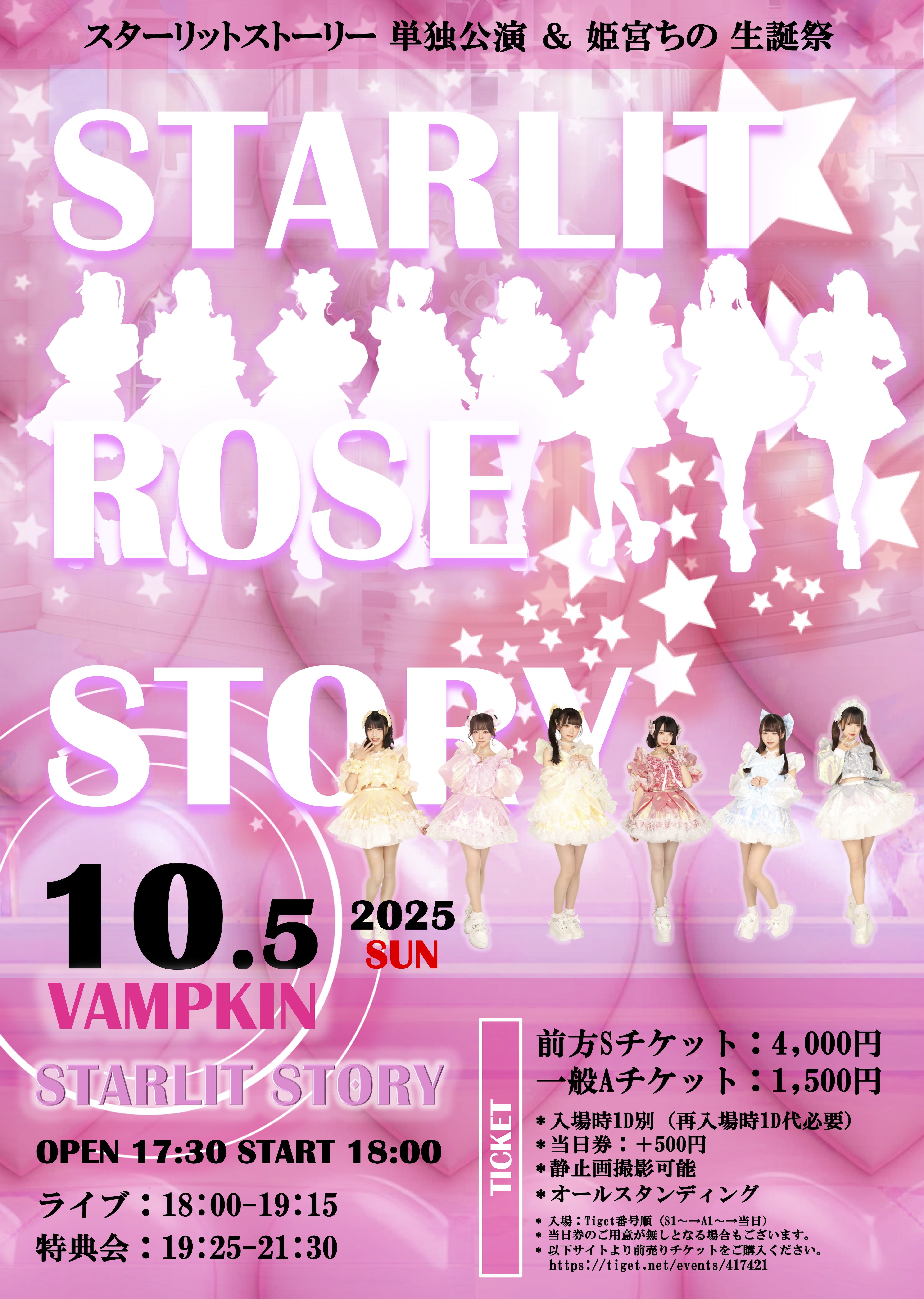 浅草 VAMPKIN スケジュール 2025.10.05(Sun) スターリットストーリー 単独公演 & 姫宮ちの生誕祭 [ACT] スターリットストーリー [OPEN/START] OPEN17:30 / START18:00 [料金] 前方S 4,000円 / 一般A 1,500円 当日+¥500- https://tiget.net/events/417421