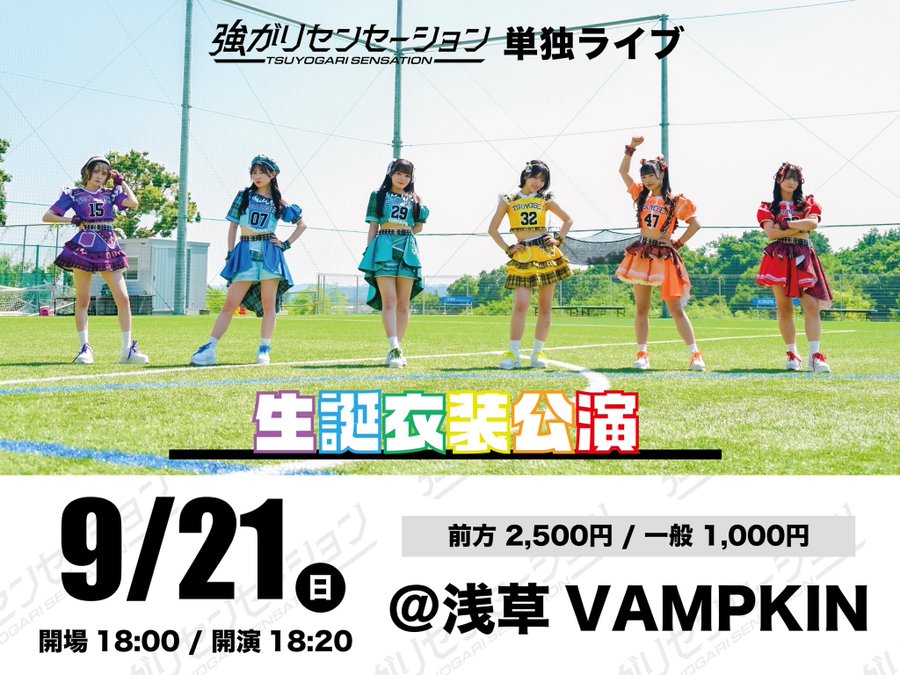 浅草 VAMPKIN スケジュール 2025.9.21(Sun) 強がりセンセーション ~生誕衣装公演~ [ACT] 強がりセンセーション [OPEN/START] 開場18:00 / 開演18:20 [料金] 前方2500円/一般1000円/当日+500円/1D別途 https://t.livepocket.jp/e/p_seo