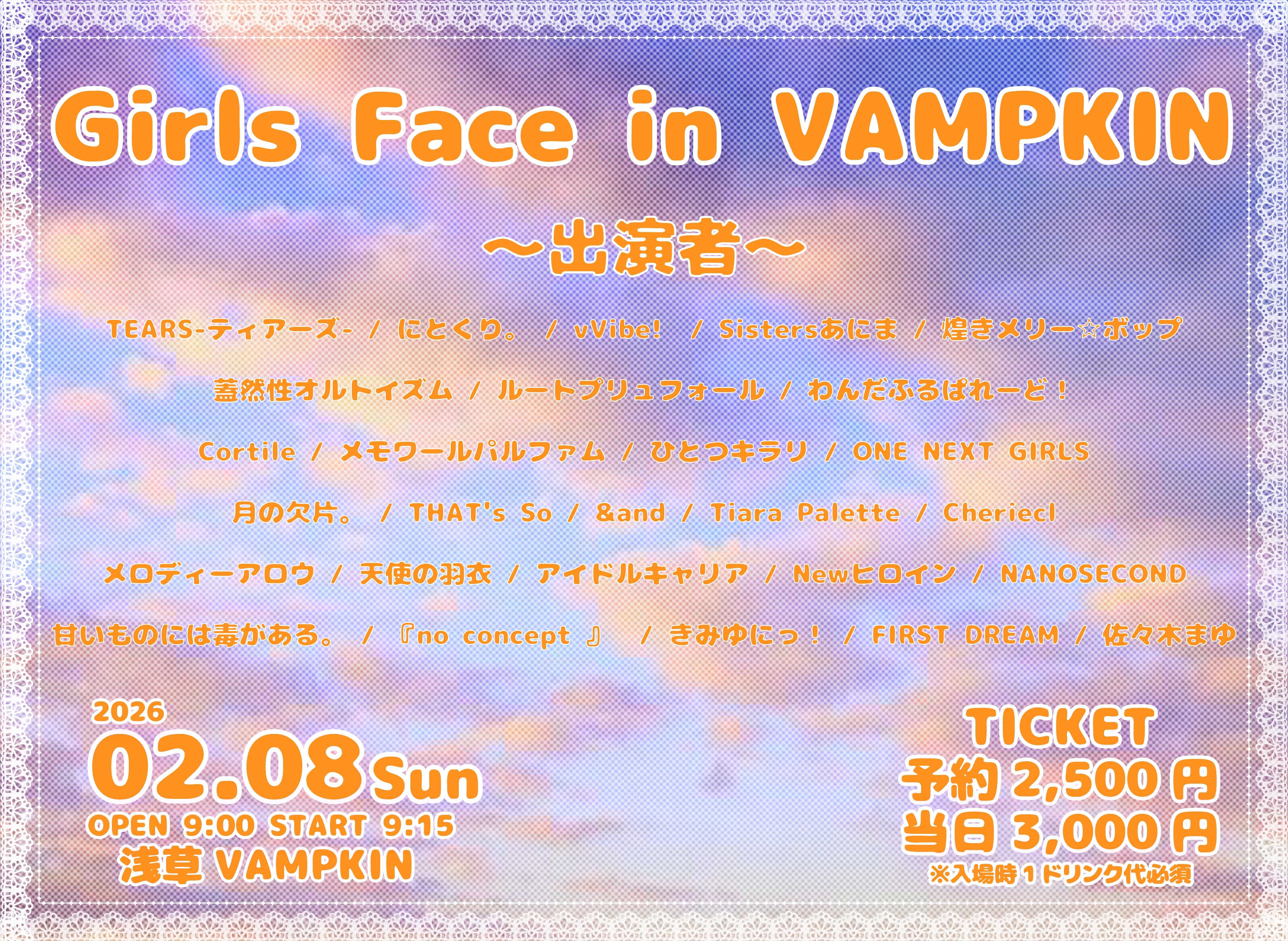 - 出演者 TEARS-ティアーズ- / にとくり。 / vVibe! / Sistersあにま / 煌きメリー☆ボップ / 蓋然性オルトイズム / ルートプリュフォール / わんだふるぱれーど! / Cortile / メモワールパルファム / ひとつキラリ / ONE NEXT GIRLS / 月の欠片。 / THAT's So / &and / Tiara Palette / Cheriecl / メロディーアロウ / 天使の羽衣 / アイドルキャリア / Newヒロイン / NANOSECOND / 甘いものには毒がある。 / 『no concept 』 / きみゆにっ! / FIRST DREAM / 佐々木まゆ
