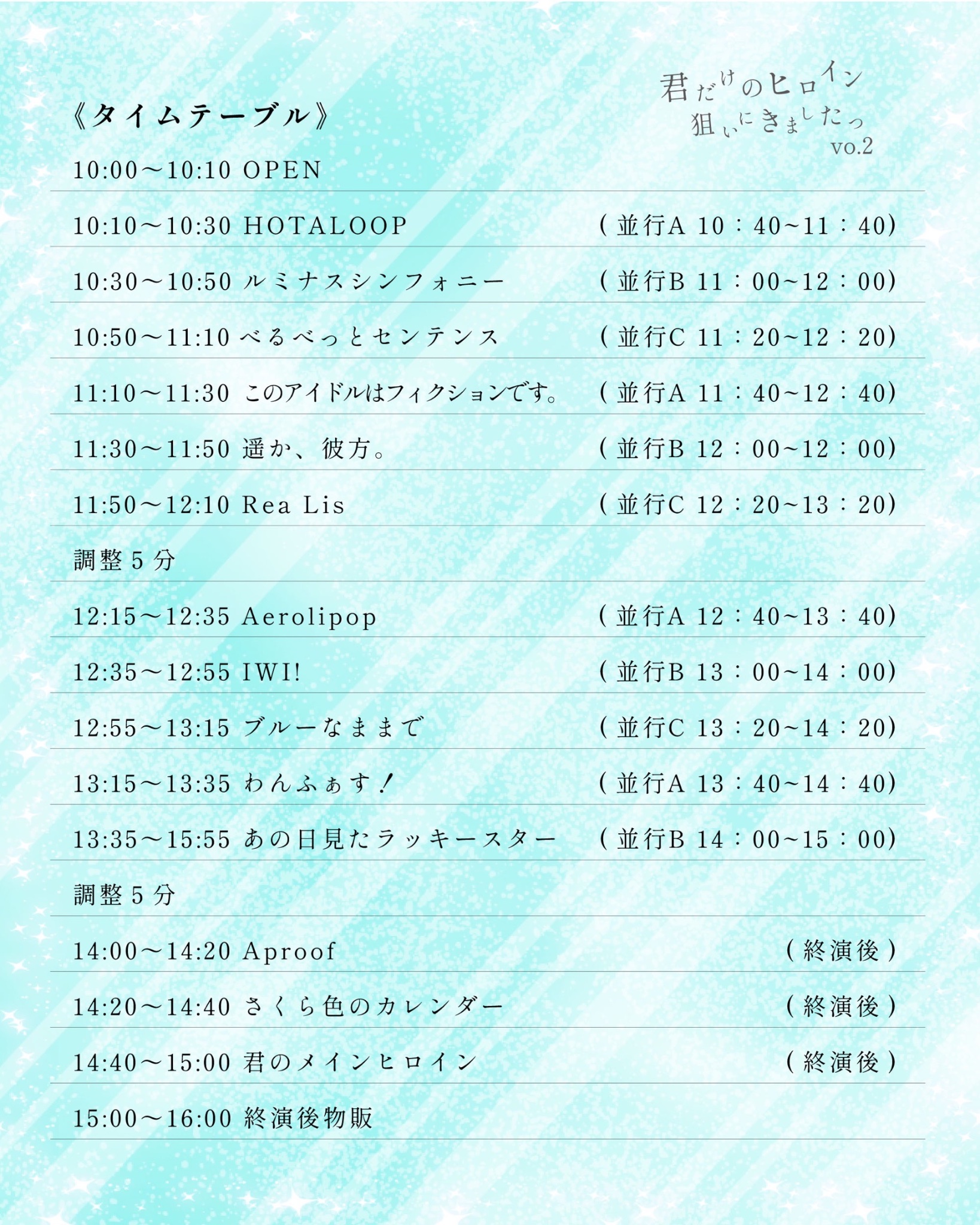 君のメインヒロイン / あの日見たラッキースター / Aproof / Aerolipop / このアイドルはフィクションです。 / さくら色のカレンダー / 遥か、彼方。 / ブルーなままで / べるべっとセンテンス / HOTALOOP / Rea Lis / ルミナスシンフォニー / わんふぁす! / IWI!