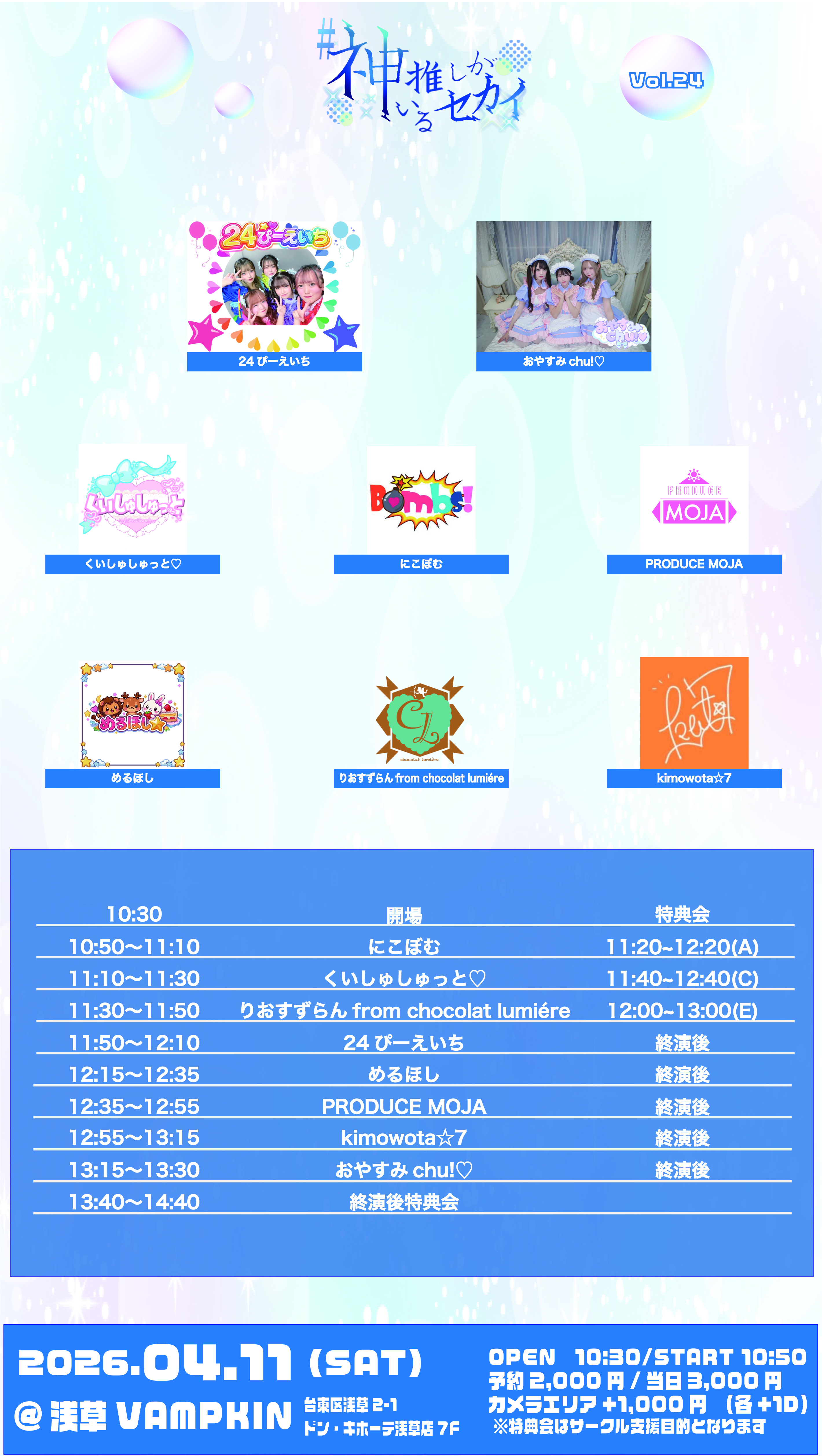 - 24ぴーえいち/おやすみchu!♡/kimowota☆7/くいしゅしゅっと♡/にこぼむ/PRODUCE MOJA/めるほし/りおすずらんfrom chocolat lumiére