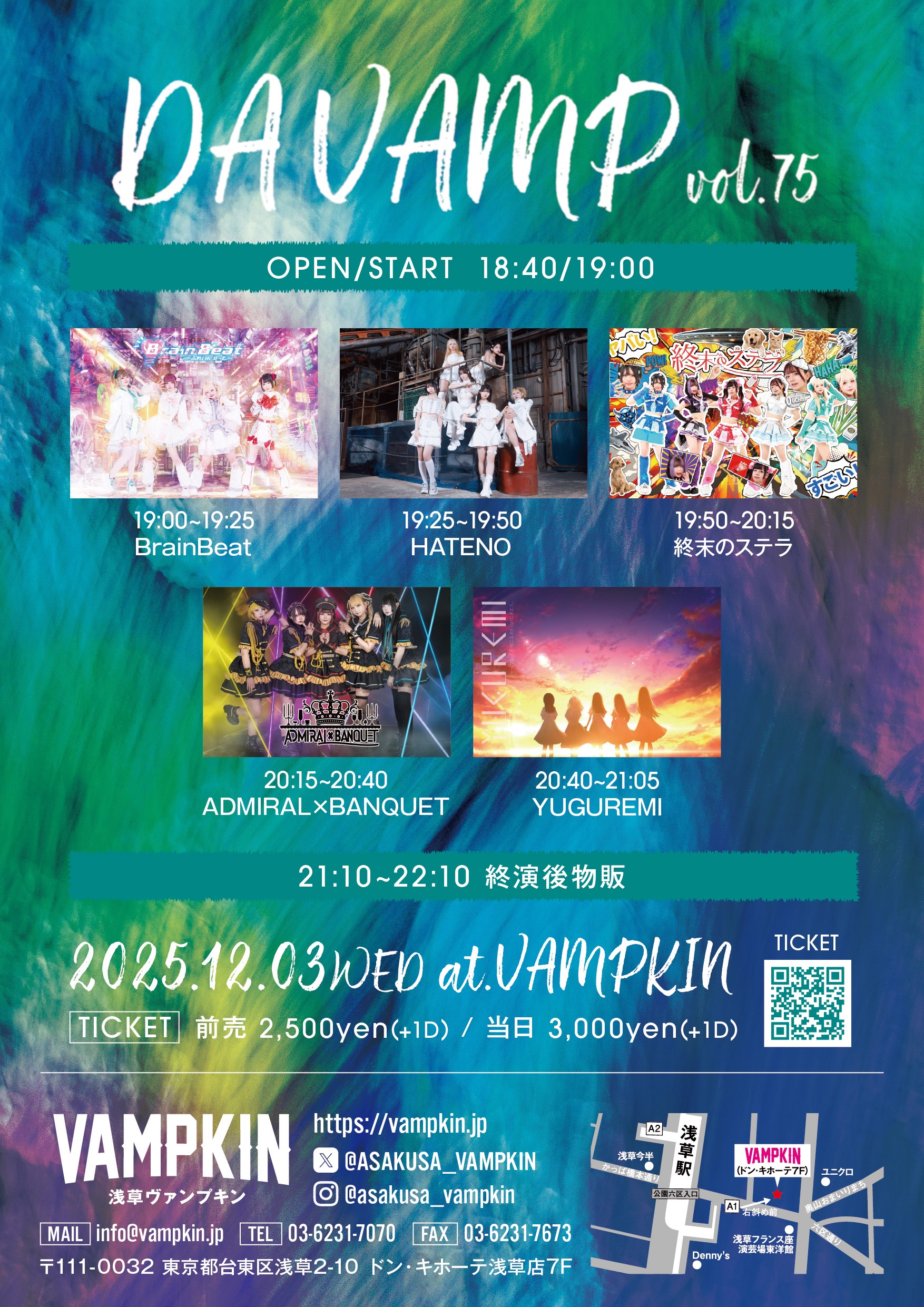 浅草 VAMPKIN スケジュール 2025.12.03(Wed) DA VAMP vol.75 [ACT] BrainBeat / HATENO / 終末のステラ / ADMIRAL×BANQUET / YUGUREMI [OPEN/START] 18:40 / 19:00 [料金] ¥2,500- / ¥3,000- (各1D別途)