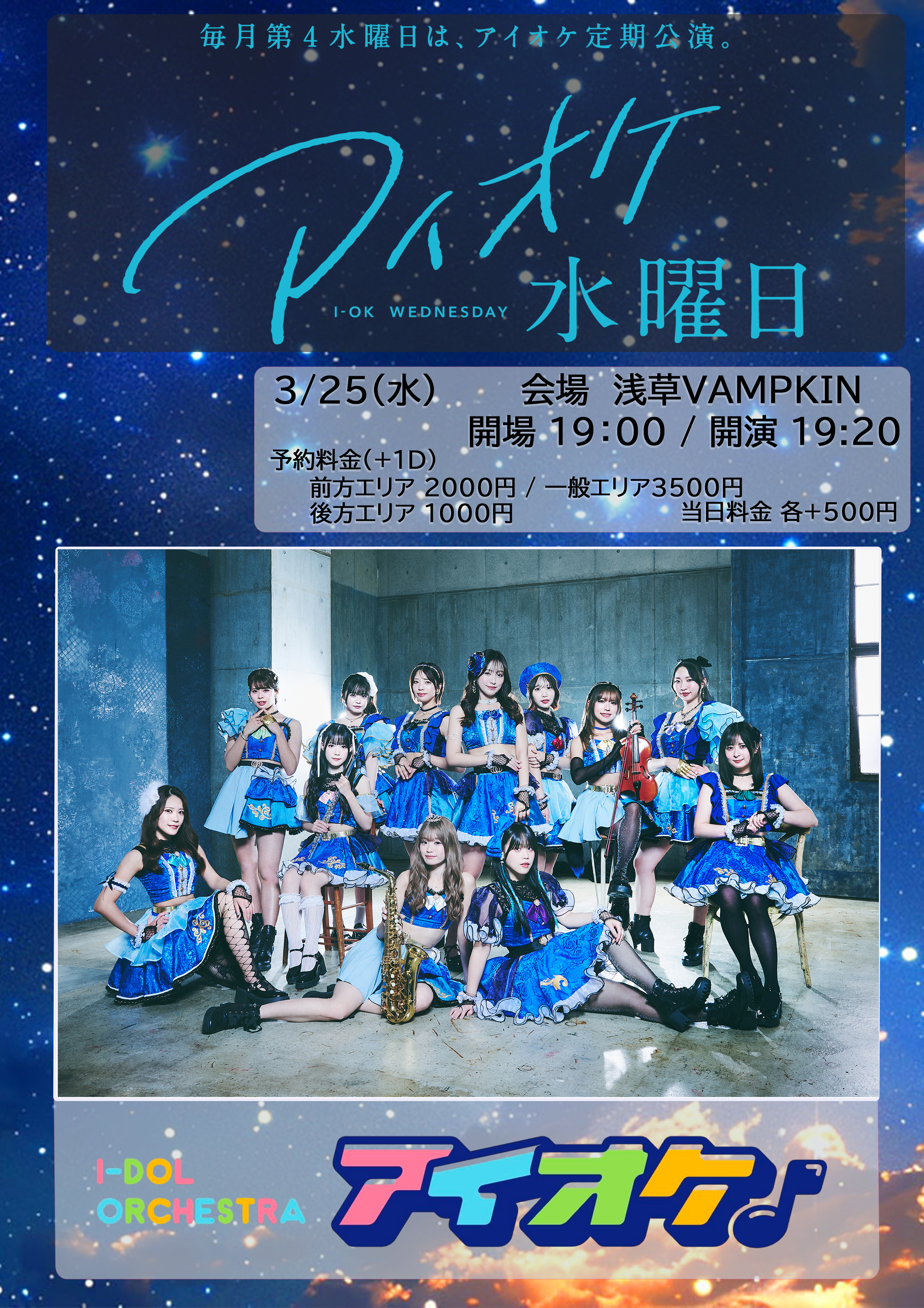 浅草 VAMPKIN スケジュール 2026.3.25(Wed) アイオケ水曜日 [ACT] アイオケ [OPEN/START] 開場19:00/開演19:20 [料金] 前方エリア2000円/一般エリア3500円/後方エリア1000円 (※当日料金 各+500円) ■予約URL https://t-dv.com/i-ok_Wednesday_13