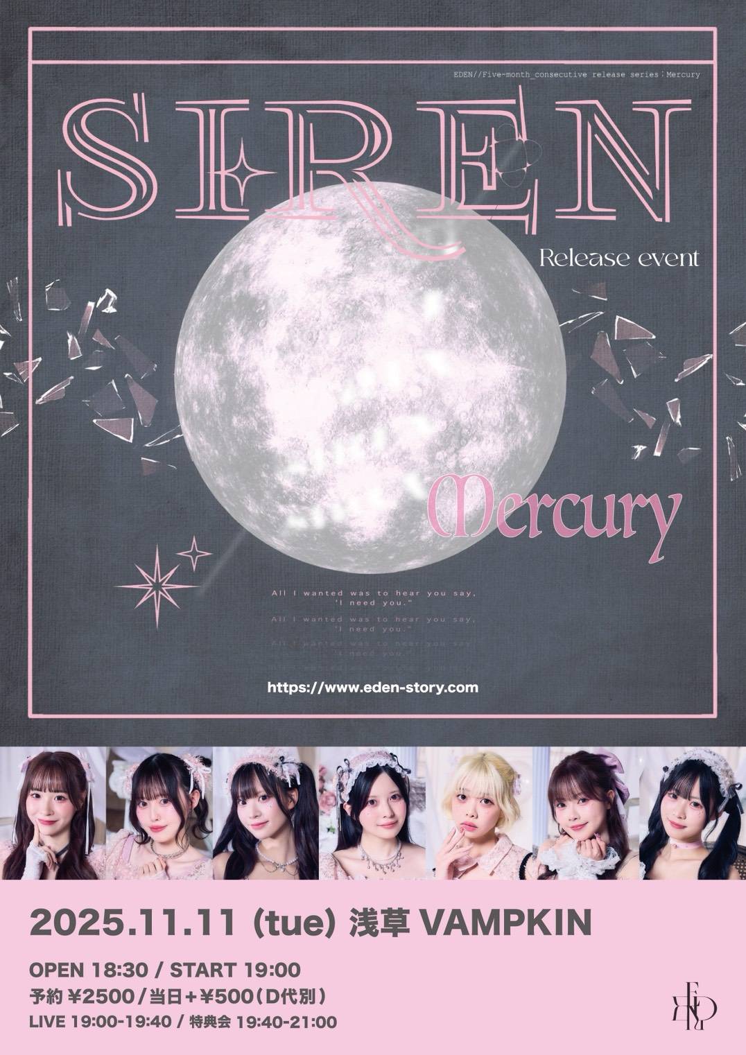 浅草 VAMPKIN スケジュール 2025.11.11(Tue) 『Mercury』 SIREN Release event [ACT] EDEN [OPEN/START] OPEN 18:30 / START 19:00 [料金] 予約¥2500/当日+¥500(D代別) https://tiget.net/events/440445