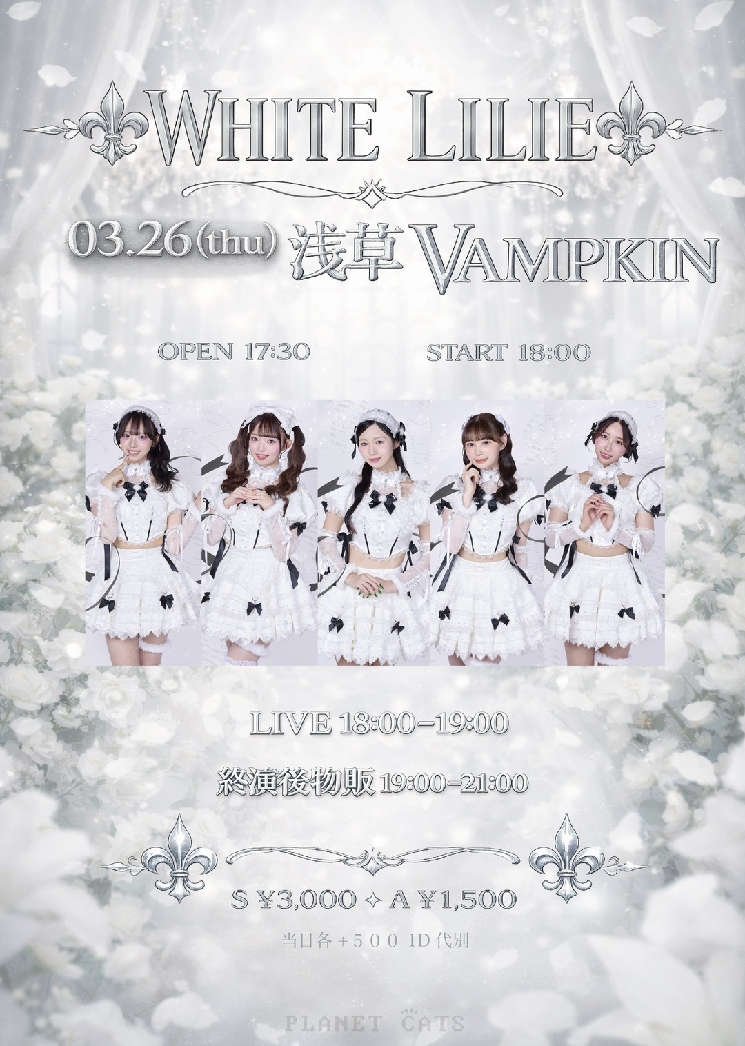 浅草 VAMPKIN スケジュール 2026.3.26(Thu) WHITE LILIE [ACT] KITTIES [OPEN/START] OPEN 17:30/ START 18:00 [料金] Sチケット¥3,000/Aチケット¥1,500/当日各+¥500/各1D代別 https://livepocket.jp/e/98zz3