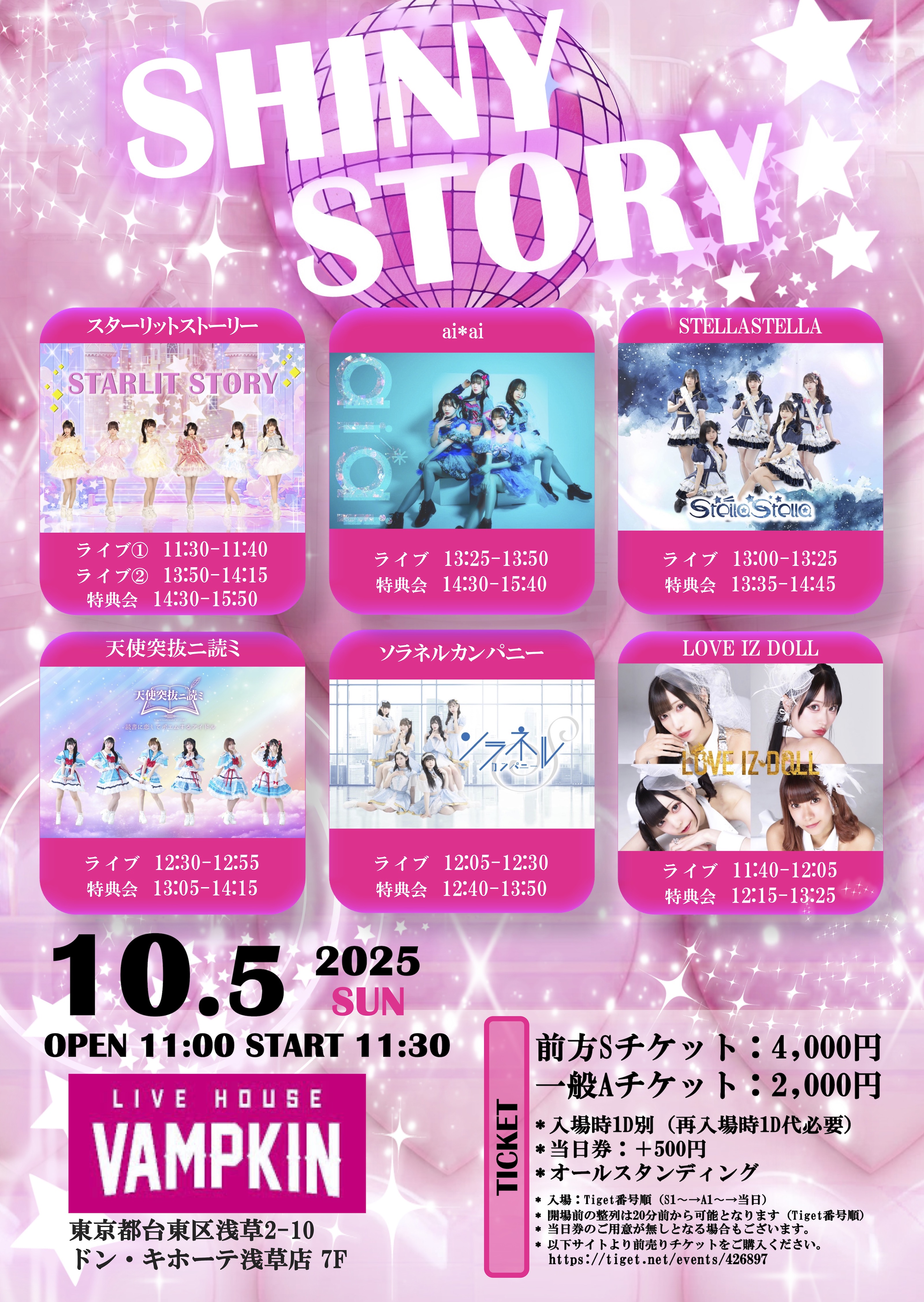浅草 VAMPKIN スケジュール 2025.10.05(Sun) SHINY STORY [ACT] スターリットストーリー/ai*ai/STELLASTELLA/天使突抜ニ読ミ/ソラネルカンパニー/LOVE IZ DOLL /♮リアスクライブ [OPEN/START] OPEN11:00 / START11:30 [料金] 前方S 4,000円 / 一般A 2,000円 当日+¥500- https://tiget.net/events/426897