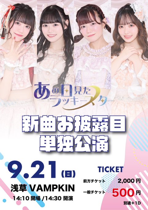 浅草 VAMPKIN スケジュール 2025.9.21(Sun) あのすた新曲お披露目単独公演 [ACT] あの日見たラッキースター [OPEN/START] 開場14:10 / 開演14:30 [料金] 前方2000円/一般500円/当日+500円/1D別途 https://tiget.net/events/425991