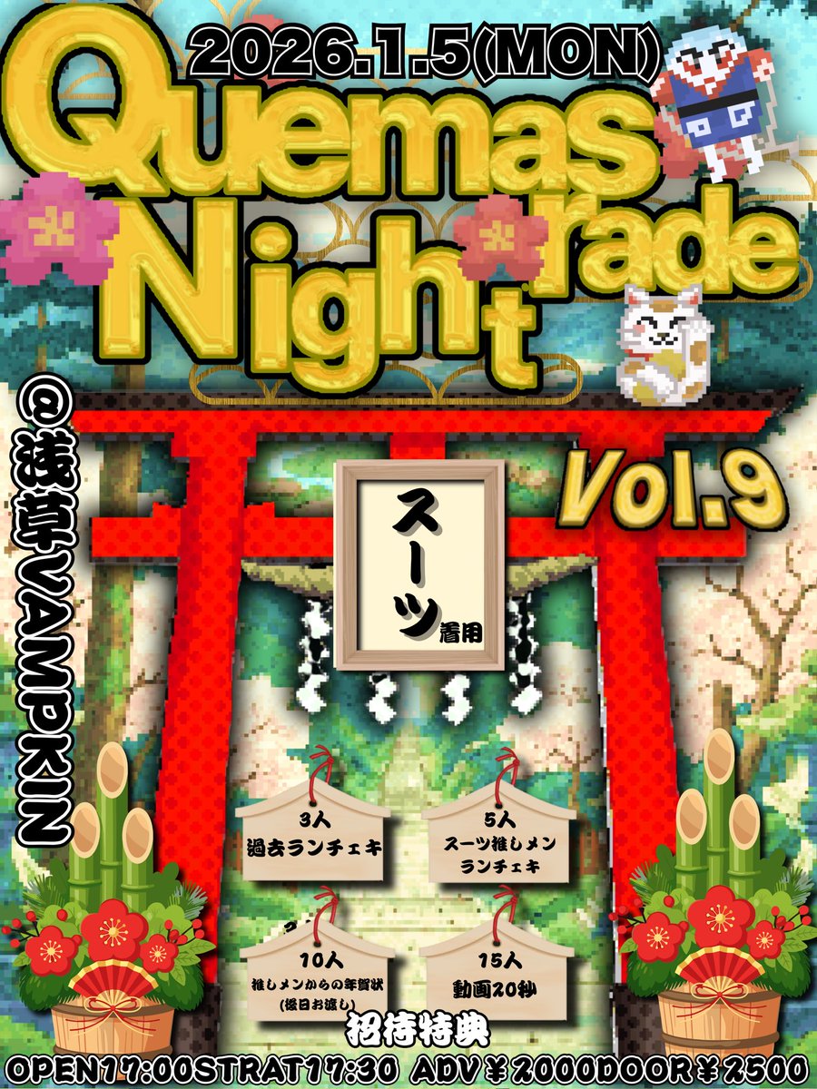 浅草 VAMPKIN スケジュール 2026.1.05(Mon) 〜Quemasrade Night Vol.9〜 [ACT] Aristocratie [OPEN/START] OPEN:17:00 START:17:30 [料金] ADV¥2,000/DOOR¥2,500(+1D)