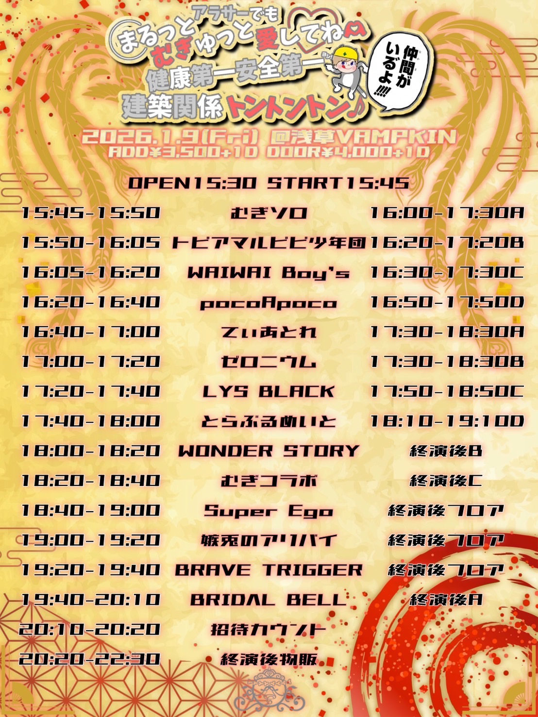 浅草 VAMPKIN スケジュール 2026.1.09(Fri) 神楽むぎ生誕祭~まるっとむぎゅっと愛してね~ [OPEN/START] OPEN:15:30 START:15:45 [料金] 前売:¥3,500 当日:¥4,000 https://t.livepocket.jp/e/mugiarasaaa