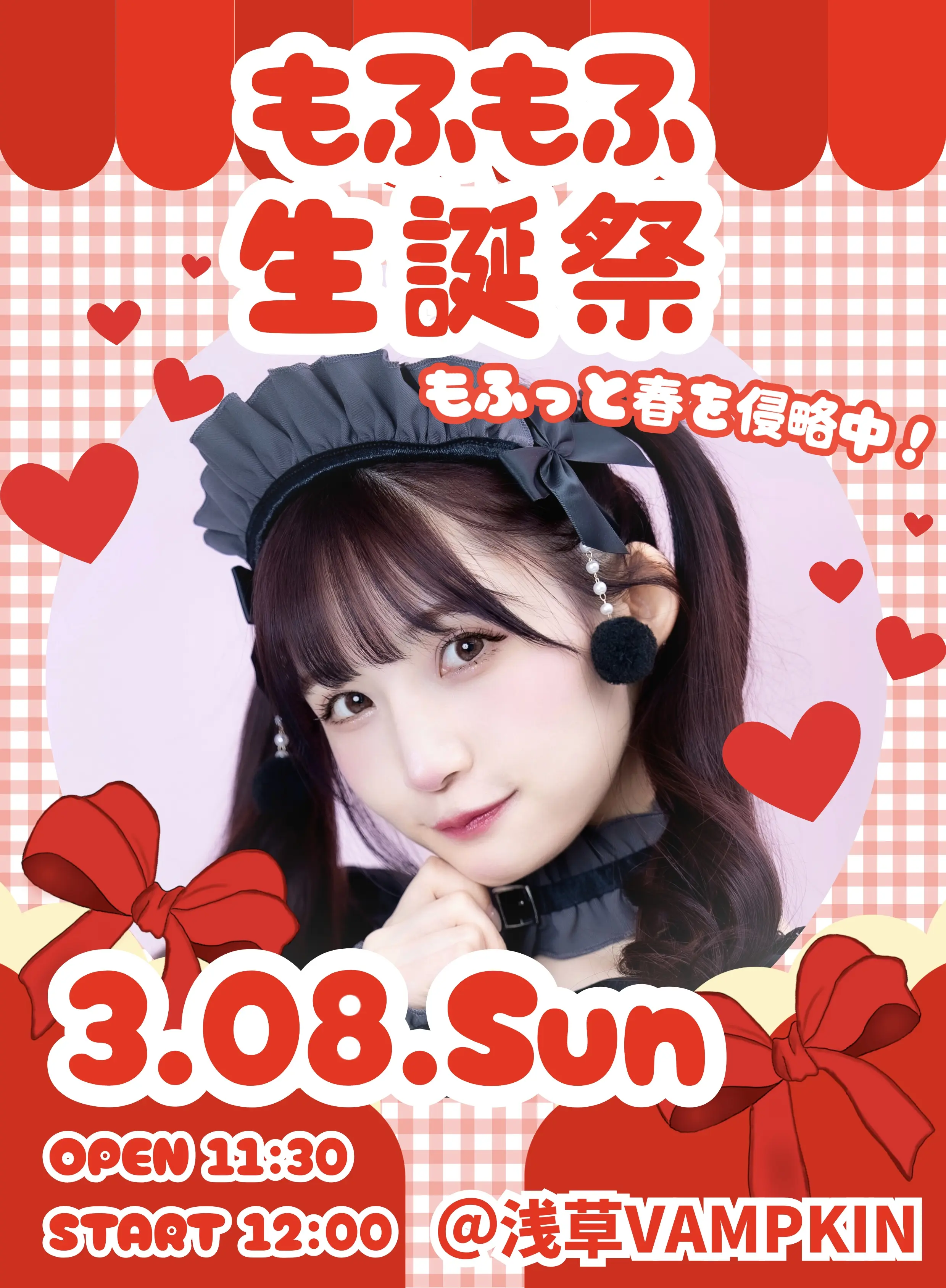 浅草 VAMPKIN スケジュール 2026.3.08(Sun) もふもふ生誕祭〜もふっと春を侵略中!〜 [ACT] もふちゃん [OPEN/START] 開場11:30 / 開演12:00 [料金] 前方席チケット¥6,000- / 一般男性チケット¥4,000- / 一般女性チケット¥3,000- / 戸田ころね推しチケット(チェキ券付き)¥4,500- 各1D別途 https://livepocket.jp/e/6l4d5