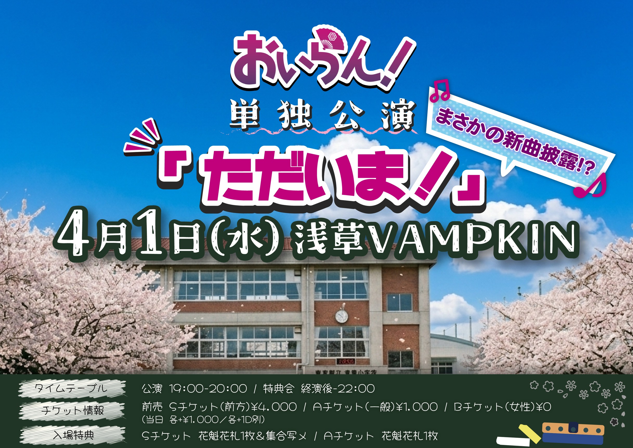 浅草 VAMPKIN スケジュール 2026.4.01(Wed) おいらん!単独公演 「ただいま!」 [ACT] おいらん! [OPEN/START] 18:40 / 19:00 [料金] 前方エリア Sチケット ¥4,000 / 一般 Aチケット ¥1,000 / 女性 Bチケット ¥0 各1D別途 https://t-dv.com/oiran-tadaima