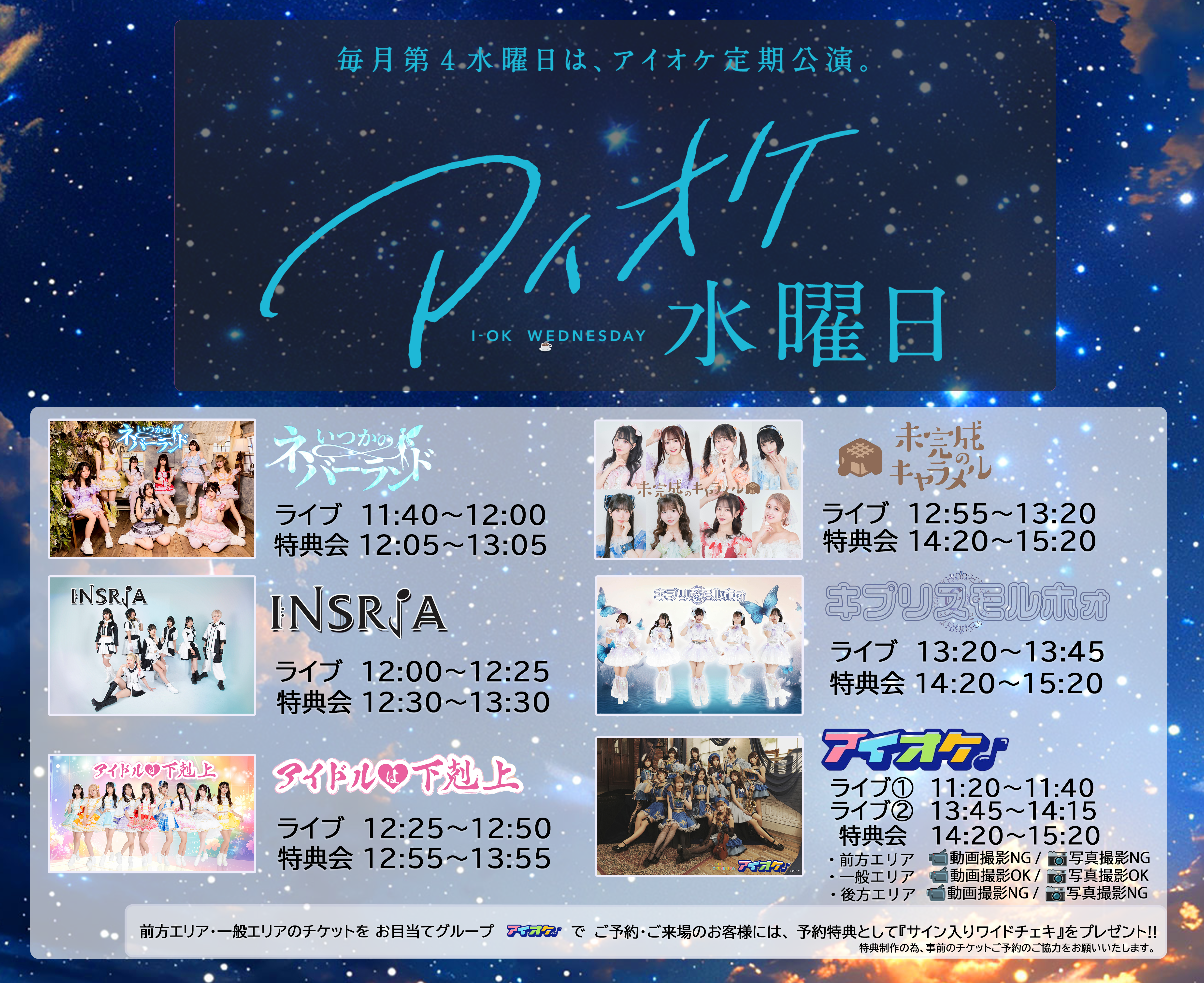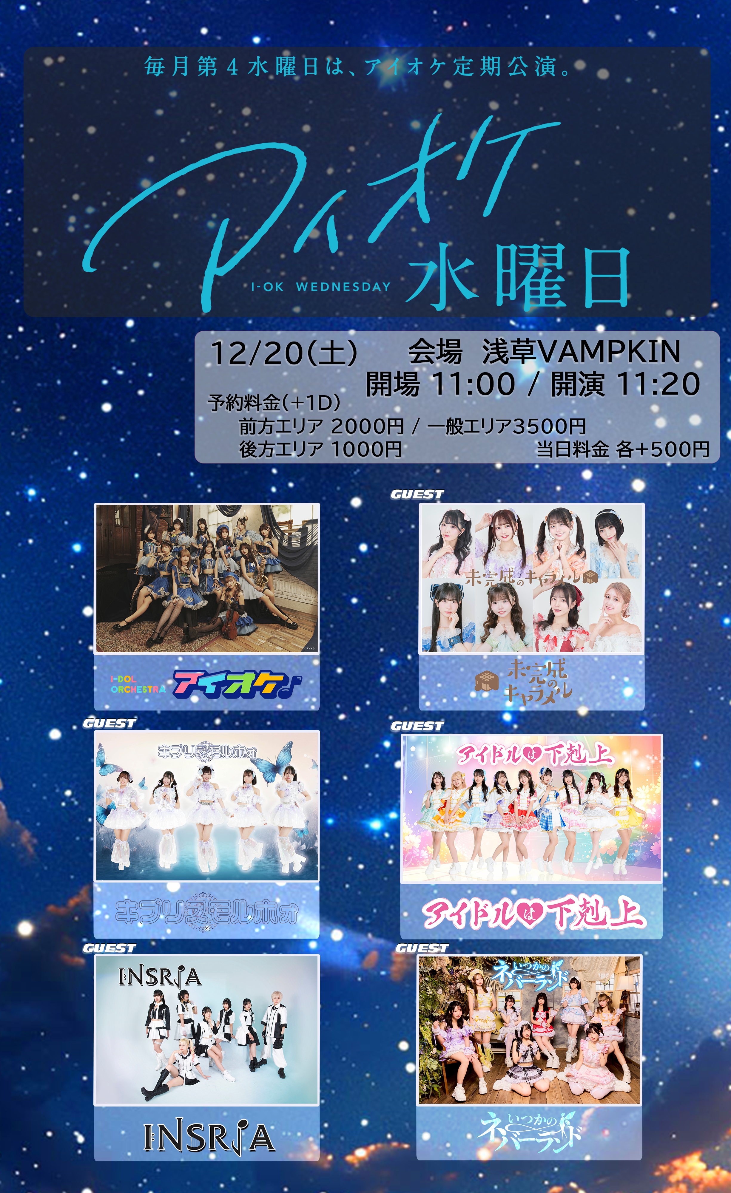 浅草 VAMPKIN スケジュール 2025.12.20(Sat) アイオケ水曜日 ~Christmas Special~ [ACT] アイオケ/未完成のキャラメル/キプリスモルホォ/アイドルは下剋上/INSRiA/いつかのネバーランド [OPEN/START] 開場11:00/開演11:20 [料金] 前方エリア2000円/一般エリア3500円/後方エリア1000円 (※当日料金 各+500円) https://t-dv.com/i-ok_Wednesday_9