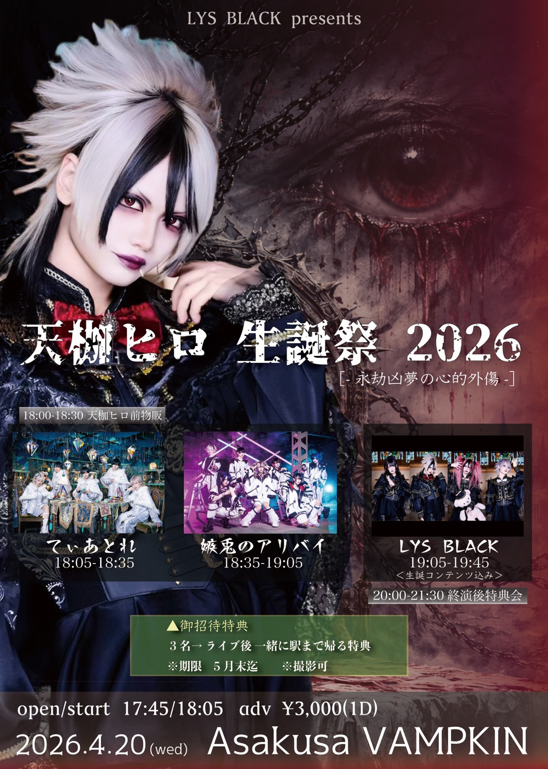 浅草 VAMPKIN スケジュール 2026.4.20(Mon) 天枷ヒロ生誕祭2026 -永劫凶夢の心的外傷- [ACT] LYS BLACK 嫉兎のアリバイ てぃあとれ [OPEN/START] open 17:45 / start 18:05 [料金] ¥3,000- https://livepocket.jp/e/wjzsg