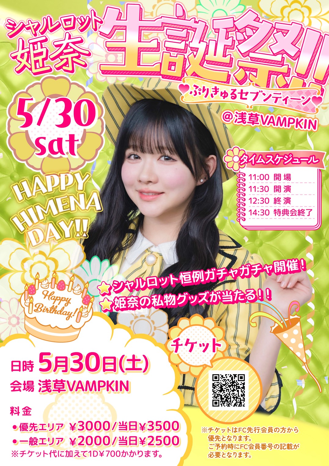 浅草 VAMPKIN スケジュール 2026.5.30(Sat) 姫奈 生誕祭 ♡ぷりきゅるセブンティーン♡ [ACT] シャルロット [OPEN/START] 11:00 / 11:30 [料金] 優先エリア¥3000/当日¥3500 一般エリア¥2000/当日¥2500 https://tiget.net/events/483534/