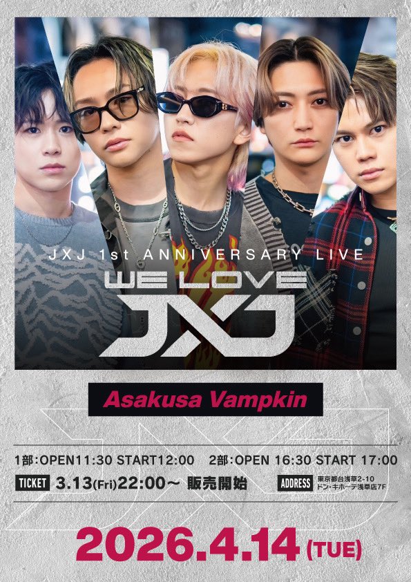 浅草 VAMPKIN スケジュール 2026.4.14(Tue) -JXJ 1st ANNIVERSAY LIVE- “WE LOVE JXJ” 【2部】 [ACT] JXJ [OPEN/START] 【2部】OPEN 16:30 / START 17:00 [料金] WE LOVE JXJ【2部】VIP ¥20,000 / 一般 ¥6,000