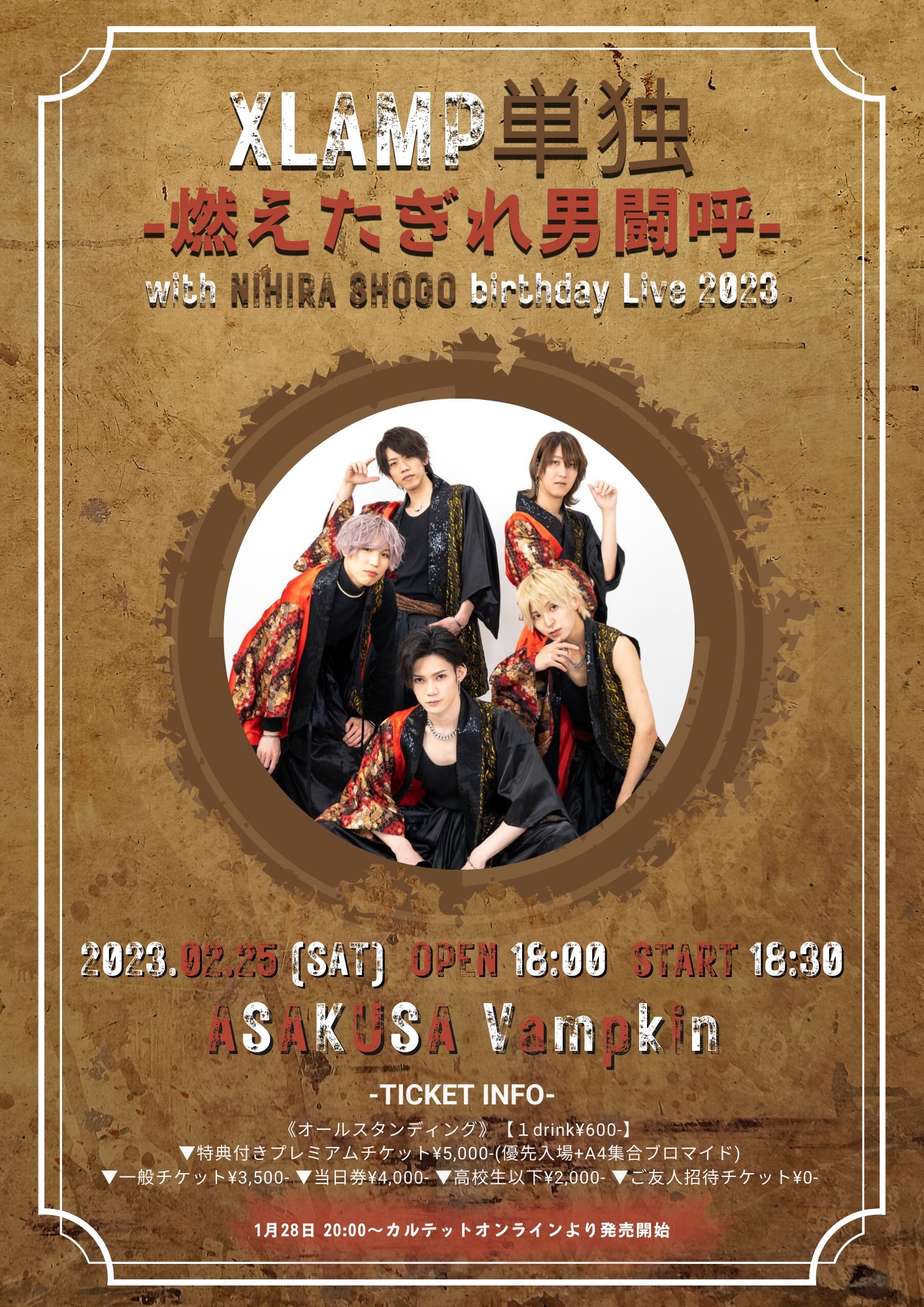 浅草 VAMPKIN スケジュール 2023.2.25(Sat) XLAMP単独!!『燃えたぎれ男闘呼』with ニ平壮悟生誕祭 [ACT] XLAMP [OPEN/START] Open 18:00 start 18:30 [料金] 特典付きプレミアムチケット¥5,000- / 一般チケット¥3,500- / 当日券¥4,000- / 高校生以下¥2,000- / ご友人招待チケット¥0- https://www.quartet-online.net/ticket/8nejvlp?m=0wahcef