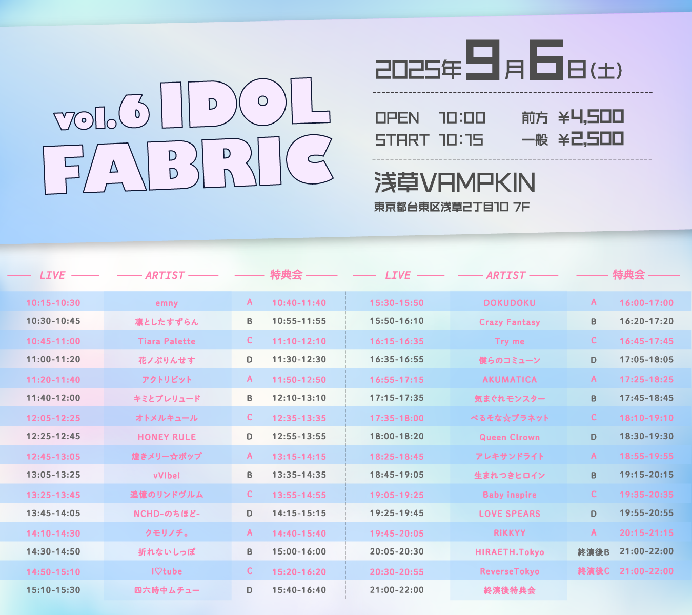- I♡tube/アクトリビット/AKUMATICA/アレキサンドライト/vVibe!/生まれつきヒロイン/emny/オトメルキュール/折れないしっぽ/気まぐれモンスター/キミとプレリュード/煌きメリー☆ボップ/Queen Clrown/クモリノチ。/Crazy Fantasy/四六時中ムチュー/追憶のリンドヴルム/Tiara Palette/DOKUDOKU/NCHD-のちほど-/花ノぷりんせす/HONEY RULE/HIRAETH.Tokyo/Baby inspire/ぺるそな✯プラネット/僕らのコミューン/LOVE SPEARS/ReverseTokyo/凛としたすずらん/四六時中ムチュー/RiKKYY/Try me