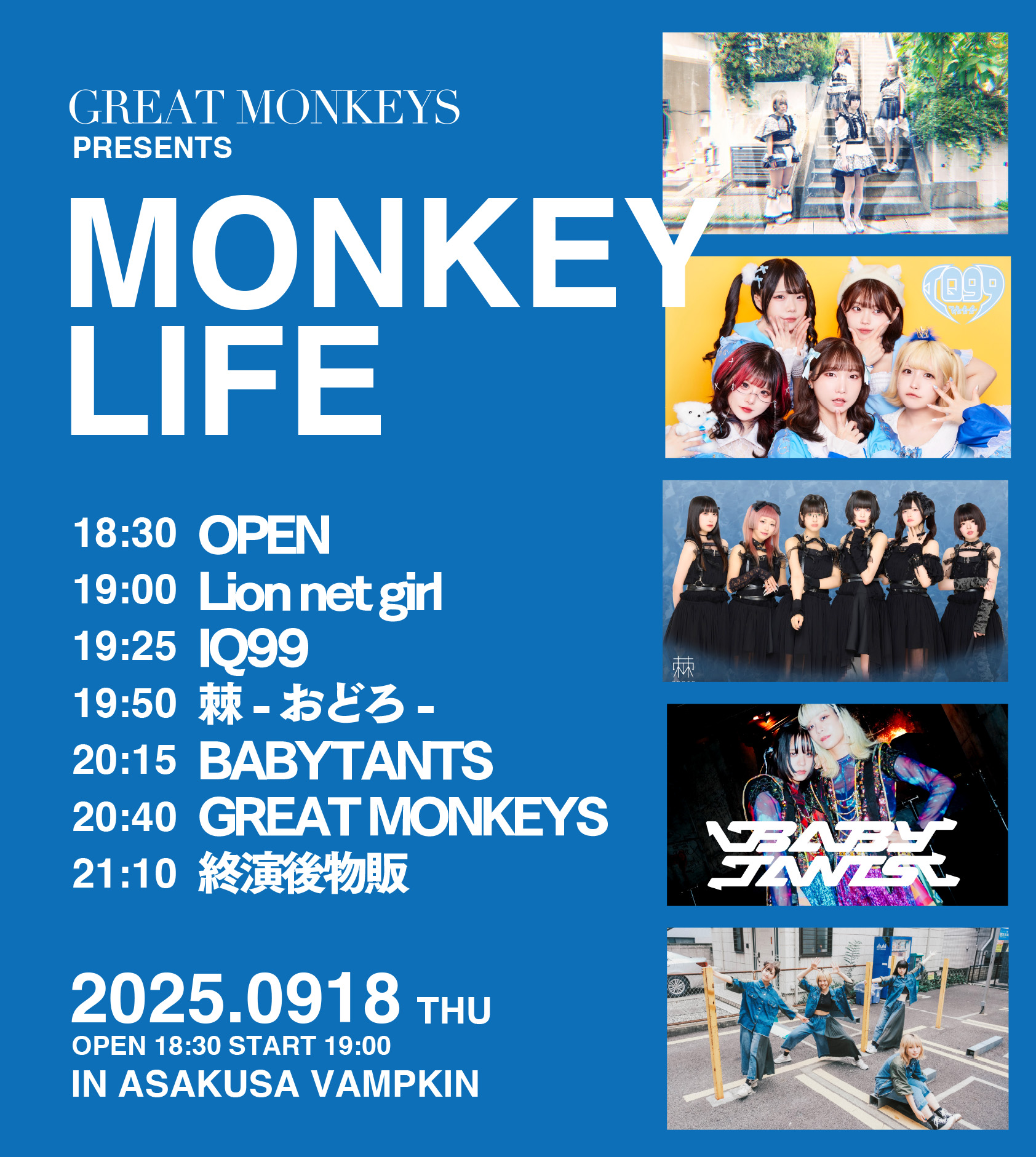 浅草 VAMPKIN スケジュール 2025.9.18(Thu) GREAT MONKEYS PRESENTS MONKEY LIFE [ACT] GREAT MONKEYS/IQ99/棘-おどろ-/BABYTANTS/Lion net girl [OPEN/START] OPEN 18:30 / START 19:00 [料金] 前売2900円 / 当日3500円(+1D)