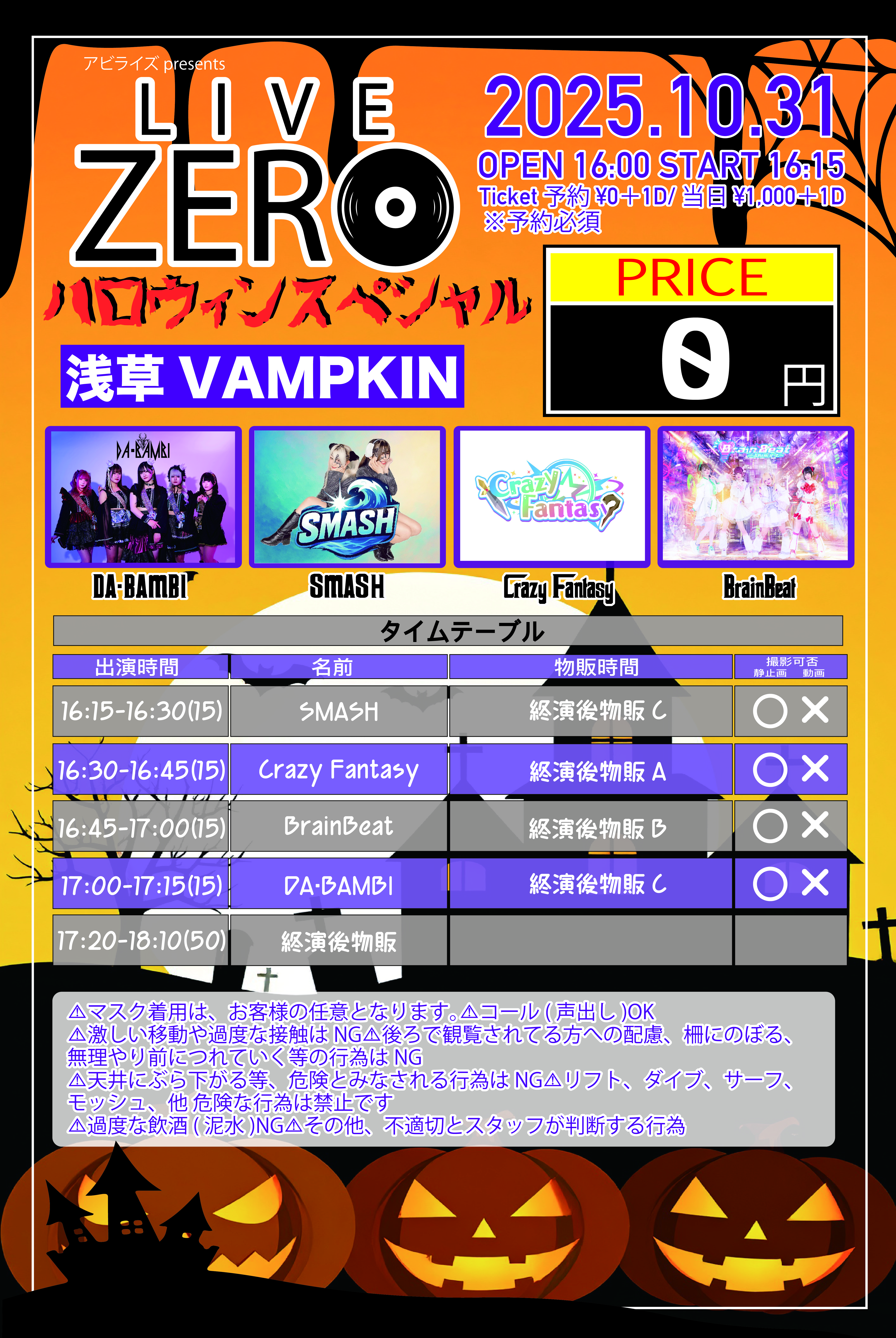 浅草 VAMPKIN スケジュール 2025.10.31(Fri) LIVE ZERO vol.11 "ハロウィンスペシャル" [ACT] DA・BAMBI/SMASH/Crazy Fantasy/BrainBeat [OPEN/START] op16:00/st16:15予定 [料金] 予約¥0(無料)/当日¥1000 ※各+1D https://t.livepocket.jp/e/live_zero_11
