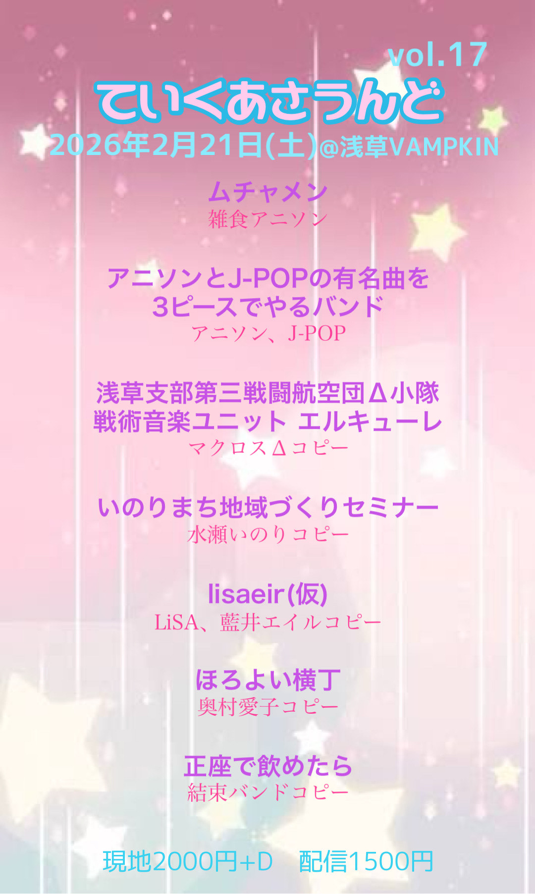 浅草 VAMPKIN スケジュール 2026.2.21(Sat) ていくあさうんど Vol.17 [ACT] ムチャメン / あにそんとJ-POPの有名曲を3ピースでやるバンド / 浅草支部第三戦闘航空団Δ小隊 戦術音楽ユニット エルキューレ / いのりまち地域づくりセミナー / lisaeir(仮) / ほろよい横丁 / 正座で飲めたら [OPEN/START] 15:15/15:45 [料金] 来場¥2,000- / 配信¥1,500- https://premier.twitcasting.tv/asakusa_vampkin/shopcart/416465