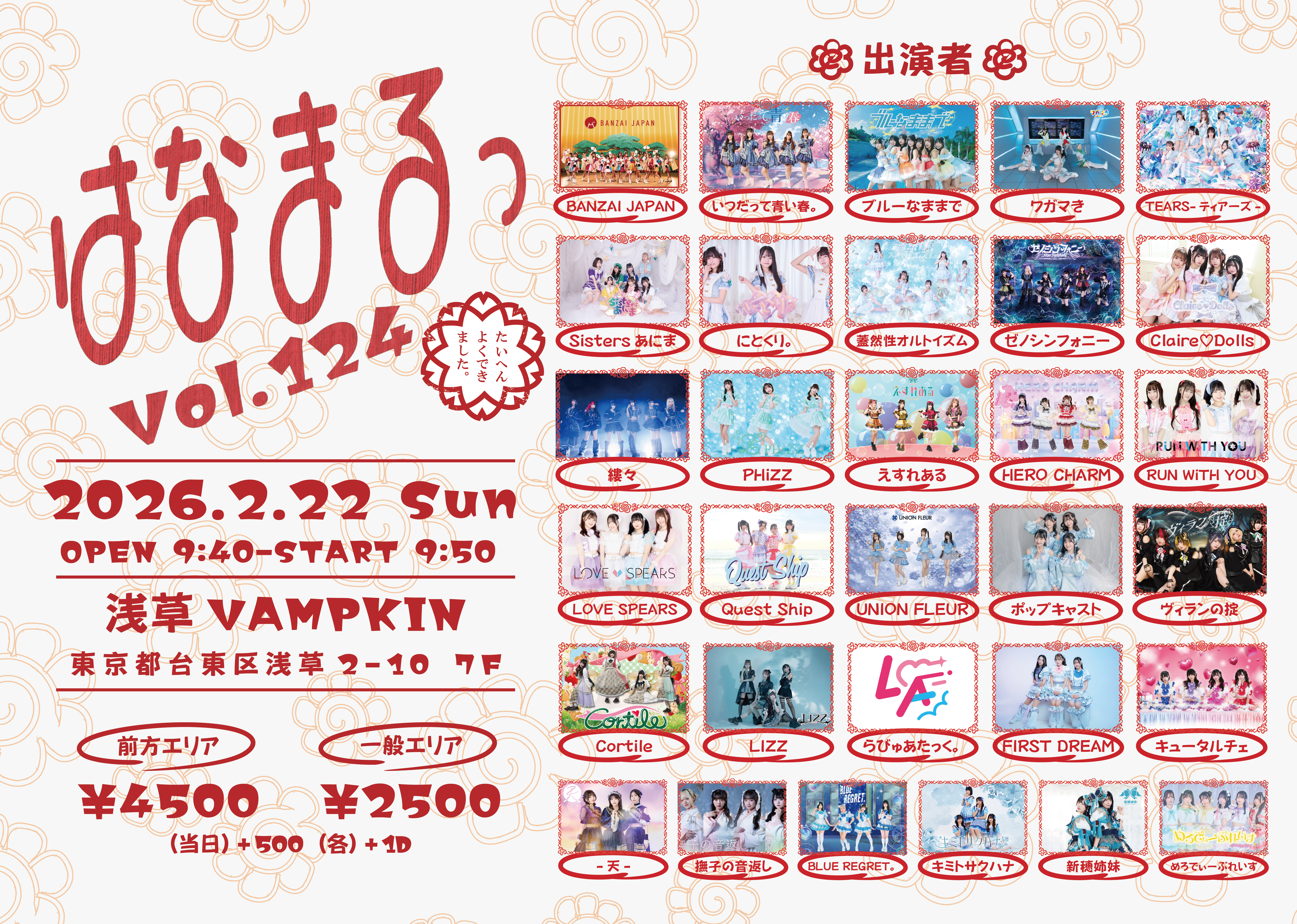 - BANZAI JAPAN/いつだって青い春。/ブルーなままで/ワガマき/TEARS-ティアーズ-/Sistersあにま/にとくり。/蓋然性オルトイズム/ゼノシンフォニー/Claire♡Dolls/縷々/PHiZZ/えすれある/HERO CHARM/RUN WiTH YOU/LOVE SPEARS/Quest Ship/UNION FLEUR/ポップキャスト/ヴィランの掟/Cortile/LIZZ/らびゅあたっく。/FIRST DREAM/キュータルチェ/-天-/撫子の音返し/BLUE REGRET。/キミトサクハナ/新穂姉妹/めろでぃーぷれいす
