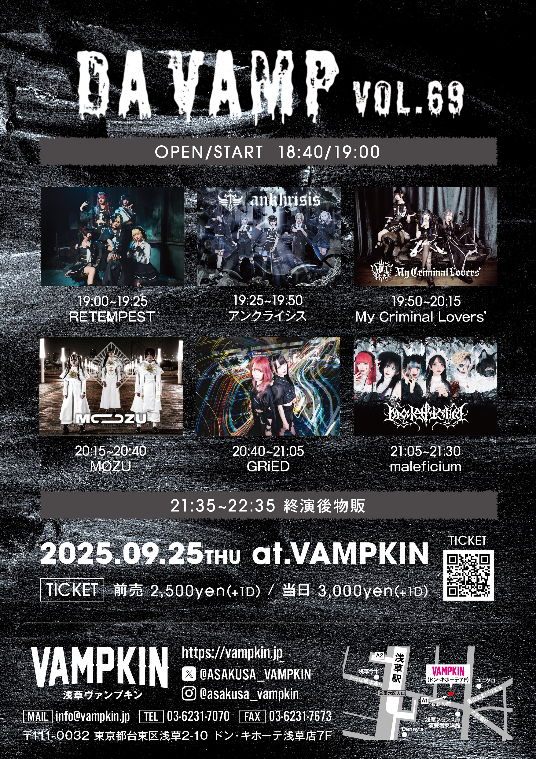 浅草 VAMPKIN スケジュール 2025.9.25(Thu) DA VAMP Vol.69 [ACT] RETEMPEST / アンクライシス / My Criminal Lovers’ / MØZU / GRiED / maleficium [OPEN/START] 18:40/19:00 [料金] ADV ¥2,500- / DOOR ¥3,000- 各1D別途 https://t.livepocket.jp/e/da_vamp_69