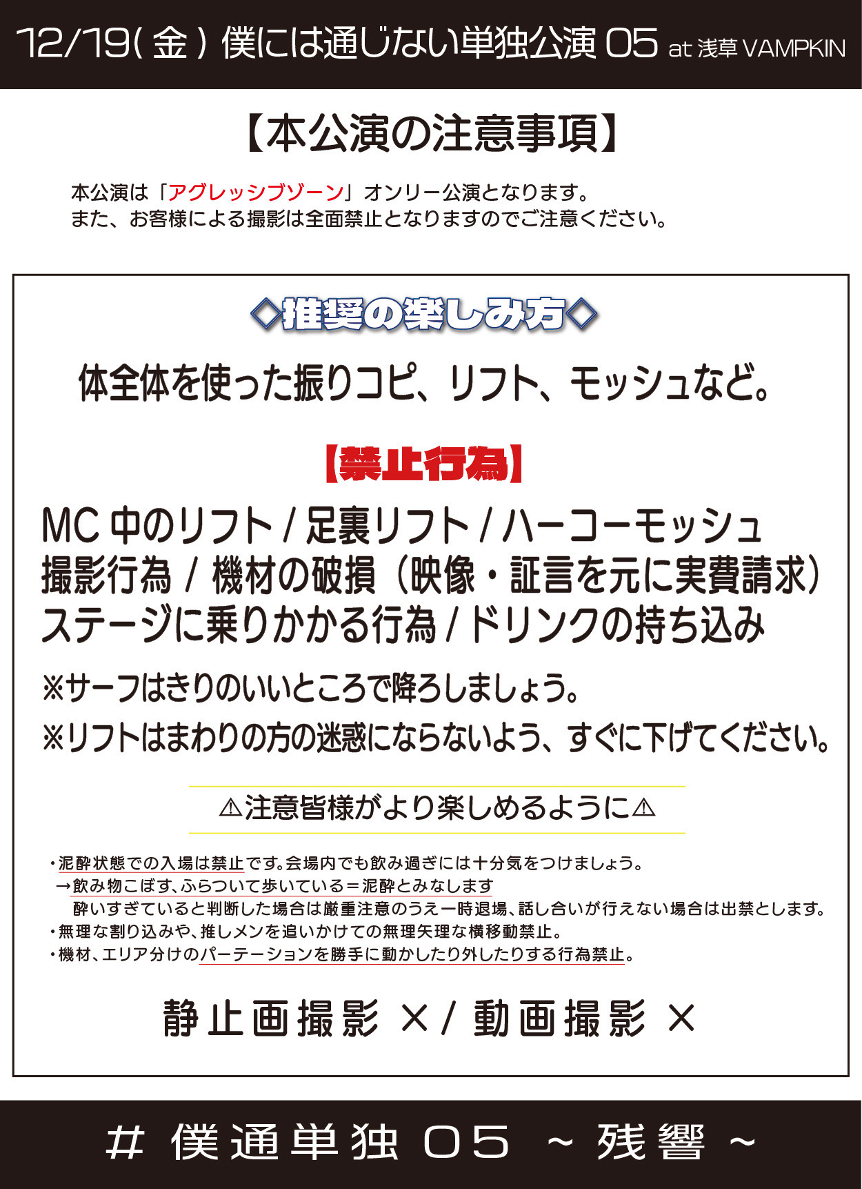 浅草 VAMPKIN スケジュール 2025.12.19(Fri) 僕には通じない単独05 アグレッシブゾーンオンリー ~残響~ [ACT] 僕には通じない [OPEN/START] 18:00/18:40 [料金] VIP¥15,000- / S¥7,000- / 早割A¥1,000- / 通常A¥2,000- 当日券(S or Aのみ)+500- 各1D別途