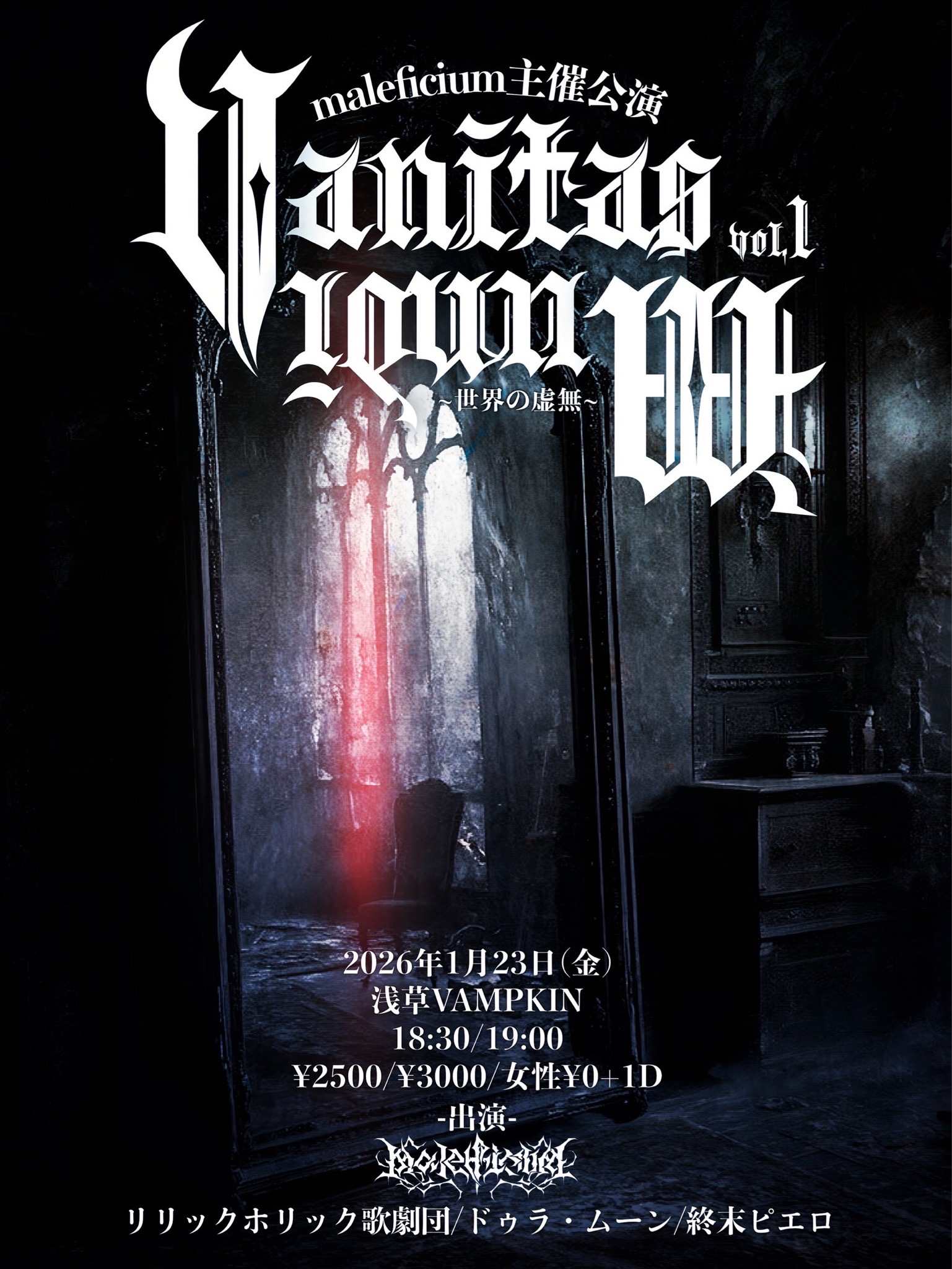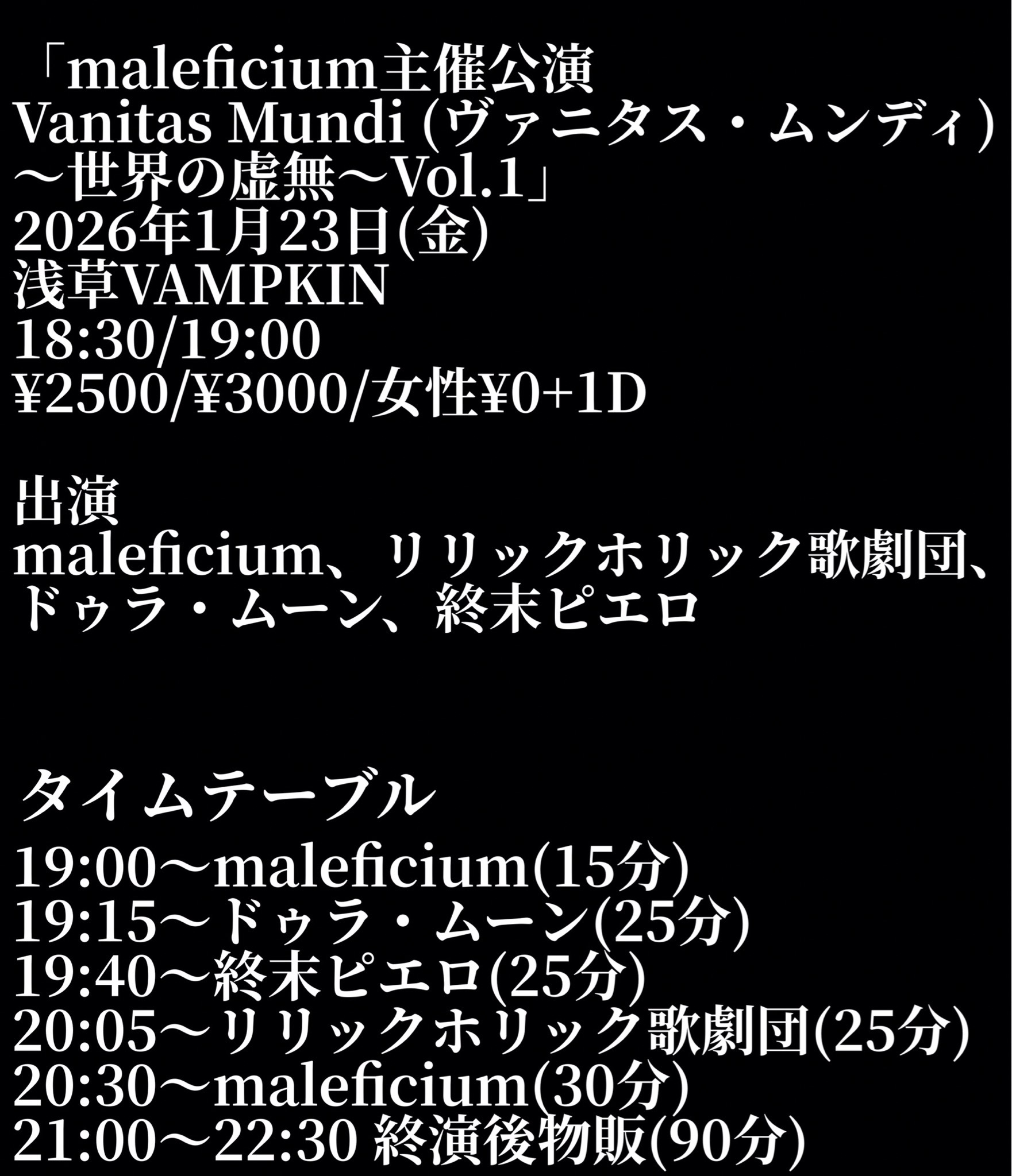 浅草 VAMPKIN スケジュール 2026.1.23(Fri) maleficium主催公演 Vanitas Mundi (ヴァニタス・ムンディ)〜世界の虚無〜Vol.1 [ACT] maleficium / リリックホリック歌劇団 / ドゥラ・ムーン / 終末ピエロ [OPEN/START] 18:30/19:00 [料金] ¥2500/¥3000/女性¥0+1D
