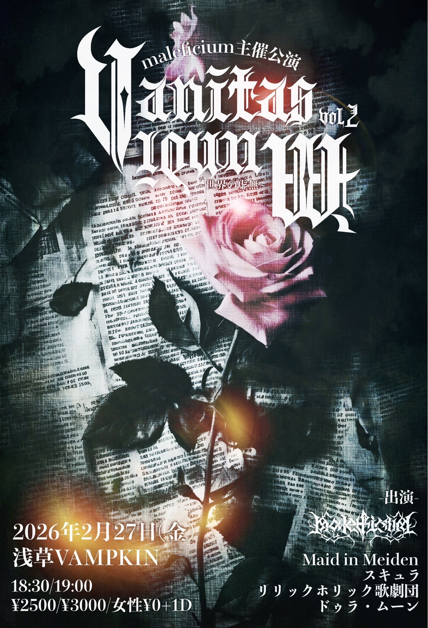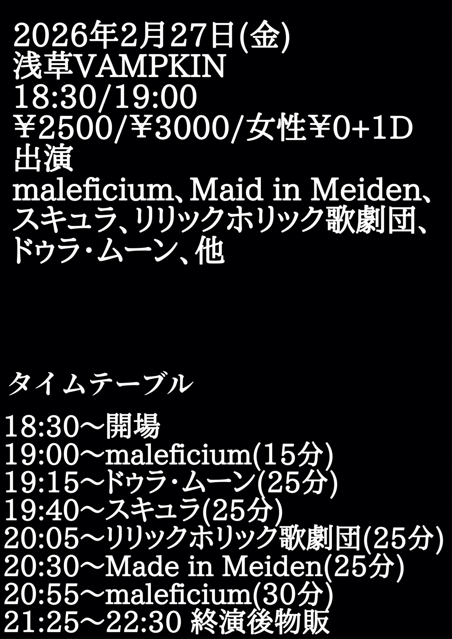 浅草 VAMPKIN スケジュール 2026.2.27(Fri) maleficium主催公演 Vanitas Mundi (ヴァニタス・ムンディ)〜世界の虚無〜Vol.2 [ACT] maleficium、Maid in Meiden、スキュラ、 リリックホリック歌劇団、ドゥラ・ムーン [OPEN/START] 18:30/19:00 [料金] ¥2500/¥3000/女性¥0+1D