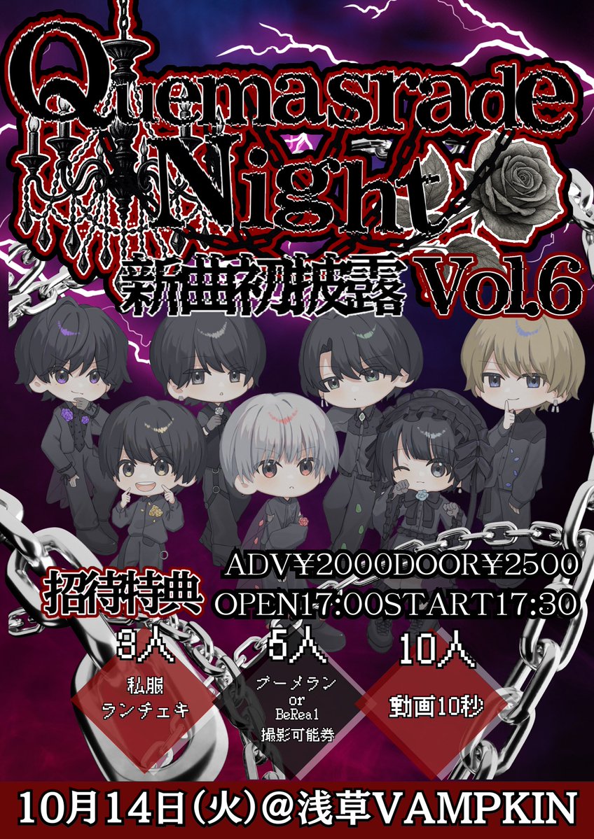 浅草 VAMPKIN スケジュール 2025.10.14(Tue) 〜Quemasrade night Vol.6〜 [ACT] Aristocratie [OPEN/START] OPEN:17:00 START:17:30 [料金] ADV¥2,000/DOOR¥2,500(+1D)