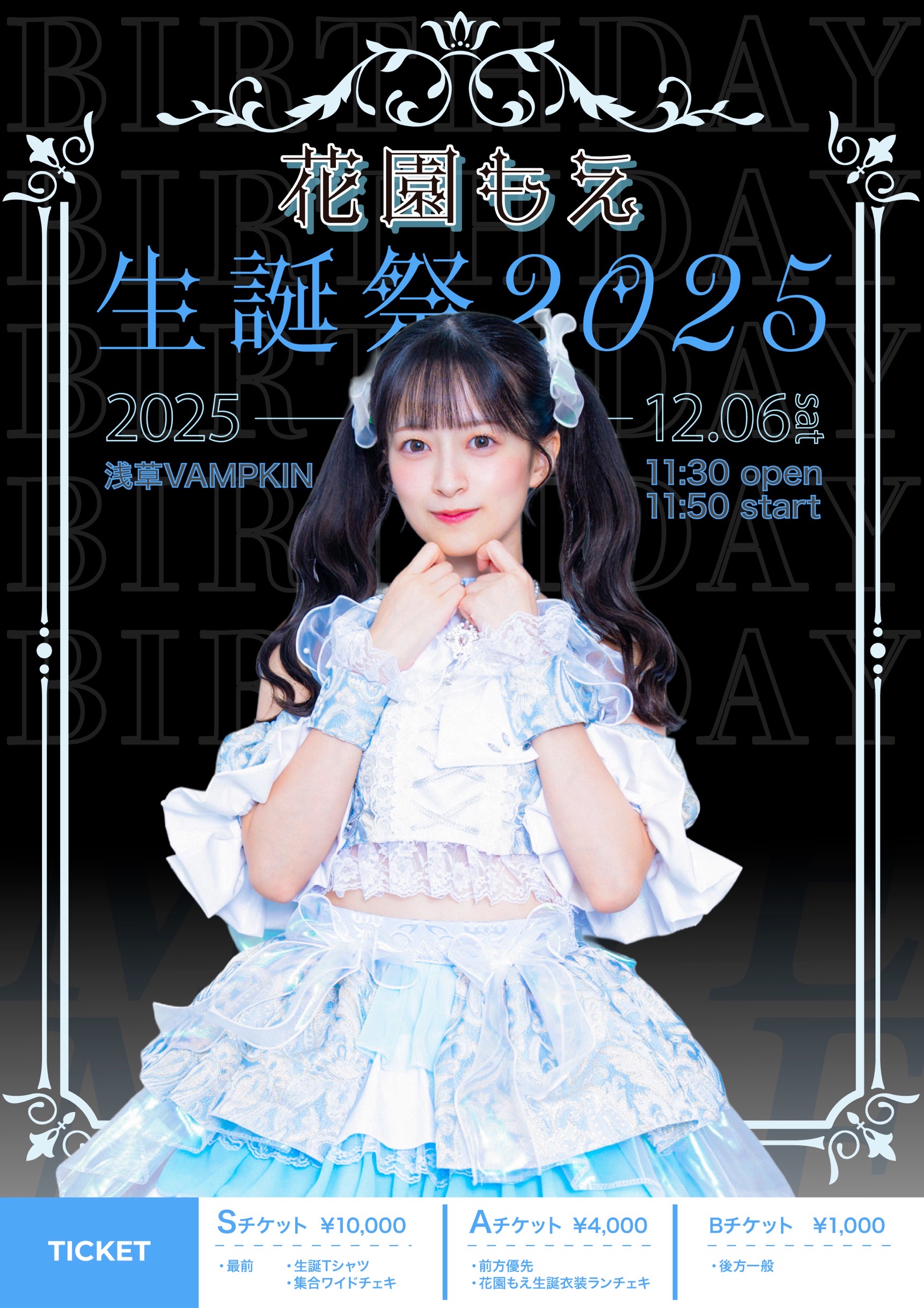 浅草 VAMPKIN スケジュール 2025.12.06(Sat) 花園もえ生誕祭2025 [ACT] Coloration [OPEN/START] 開場日時 11:30 開演日時 11:50 [料金] 〈Sチケット〉 ¥10,000 ・最前列確定 ・生誕Tシャツ ・集合ワイドチェキ ※特典会開始前に撮影 〈Aチケット〉 ¥4,000 ・前方優先 ・花園もえ生誕衣装ランチェキ ※入場時にお渡し 〈Bチケット〉 ¥1,000 ・後方一般 ※各+1D ※当日券 各+¥500