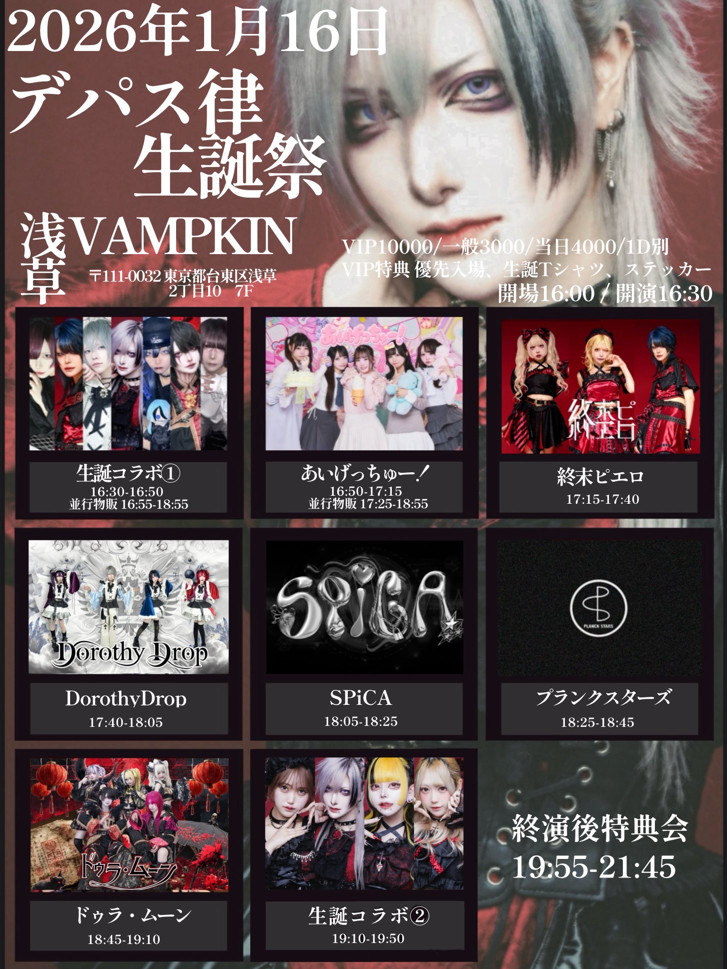 浅草 VAMPKIN スケジュール 2026.1.16(Fri) デパス律生誕祭2026 [ACT] 生誕コラボユニット(旧JUGS MAFIA&SPユニット),プランクスターズ,ドゥラ・ムーン,SPiCA,DorothyDrop,終末ピエロ,あいげっちゅー! [OPEN/START] OPEN:16:00/START:16:30 [料金] VIP:¥10,000(数量限定)(+1D別)一般:adv.¥3,000/day.¥4,000(+1D別) https://tiget.net/events/446835
