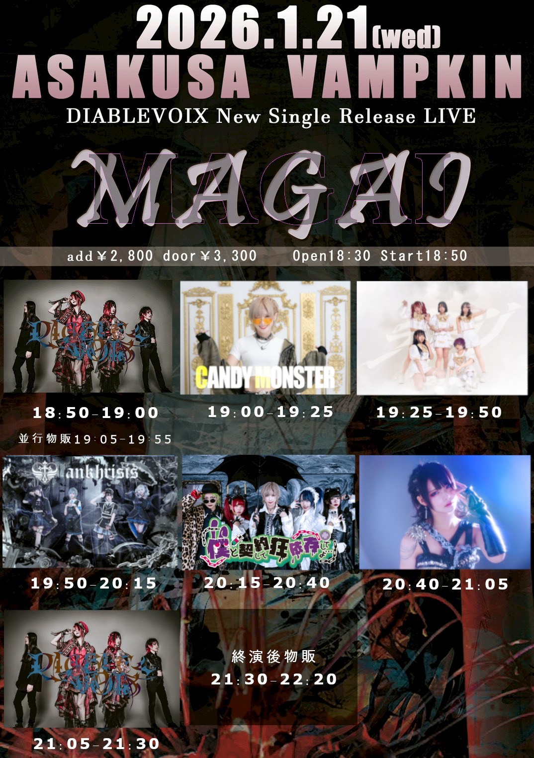 浅草 VAMPKIN スケジュール 2026.1.21(Wed) ディアブルボアNewSingle Release主催LIVE MAGAI [ACT] ディアブルボア / チギリ / アンクライシス / てのひらえる / 僕と契約して狂依存してよ… / CANDY MONSTER [OPEN/START] Open18:30 start18:50 [料金] 前売り¥2,800 当日3,300 https://tiget.net/events/454828