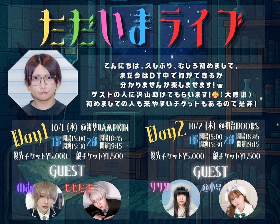 浅草 VAMPKIN スケジュール 2025.10.01(Wed) ただいまライブ Day1 [ACT] いりぽん/のあさま/ももたろ [OPEN/START] 2部 18:45/19:15 [料金] 優先チケット(前方着席) ・5,000円[D別] 一般チケット ・1,500円[D別]