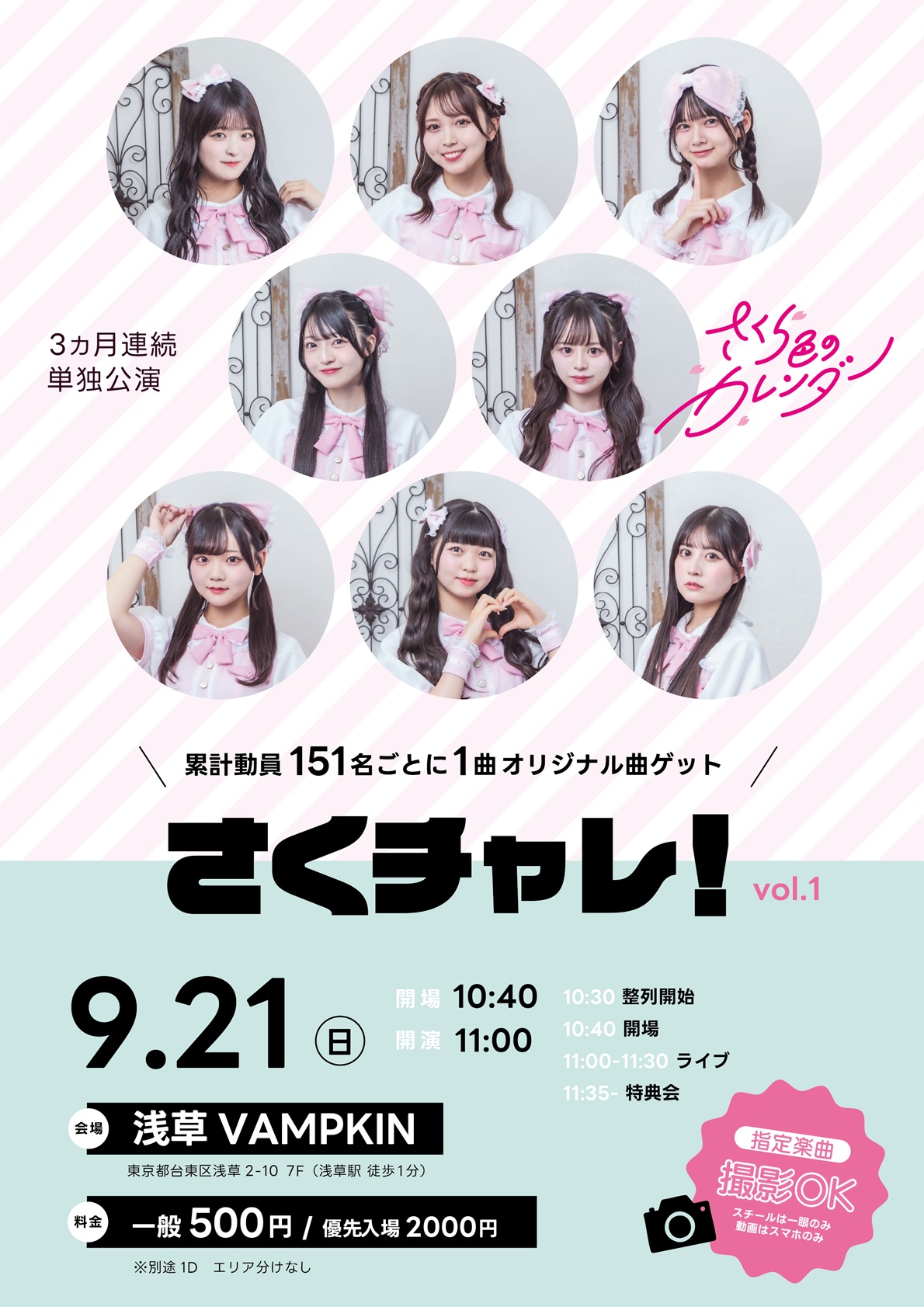 浅草 VAMPKIN スケジュール 2025.9.21(Sun) さくチャレ!vol.1 [ACT] さくら色のカレンダー [OPEN/START] 開場10:40 / 開演11:00 [料金] 優先2000円/一般500円/当日+500円/1D別途 https://t.livepocket.jp/e/skcl_20250921