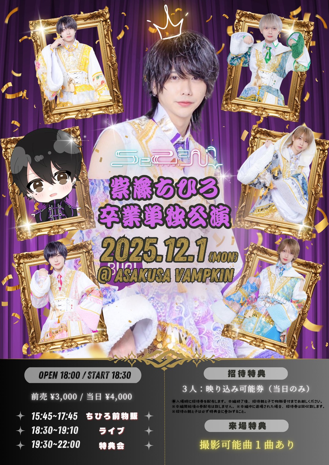 浅草 VAMPKIN スケジュール 2025.12.01(Mon) Se2aN⤵︎単独公演『紫藤ちひろ卒業公演』 [ACT] Se2aN⤵︎ [OPEN/START] 開場18:00/開演18:30 [料金] 前売¥3,000/当日¥4,000