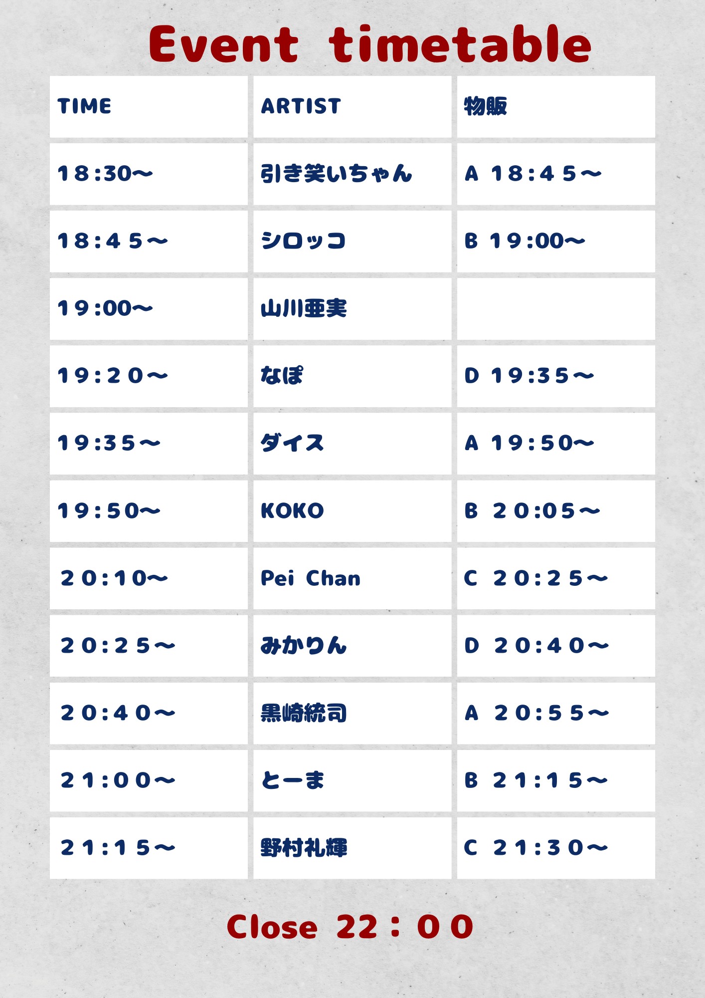 - • Sチケット:10,000円(+1D)限定30枚 ┗ 優先入場+推しアーティスト1名のLIVE動画+コメント動画 +当日限定アーティスト集合写特典付き • 応援チケット:5,000円 ※このチケットでは入場できません。 ┗ 推しアーティスト1名の LIVE動画+コメント動画 付き • 通常チケット:5,000円(+1D) • 当日チケット:5,500円(+1D)