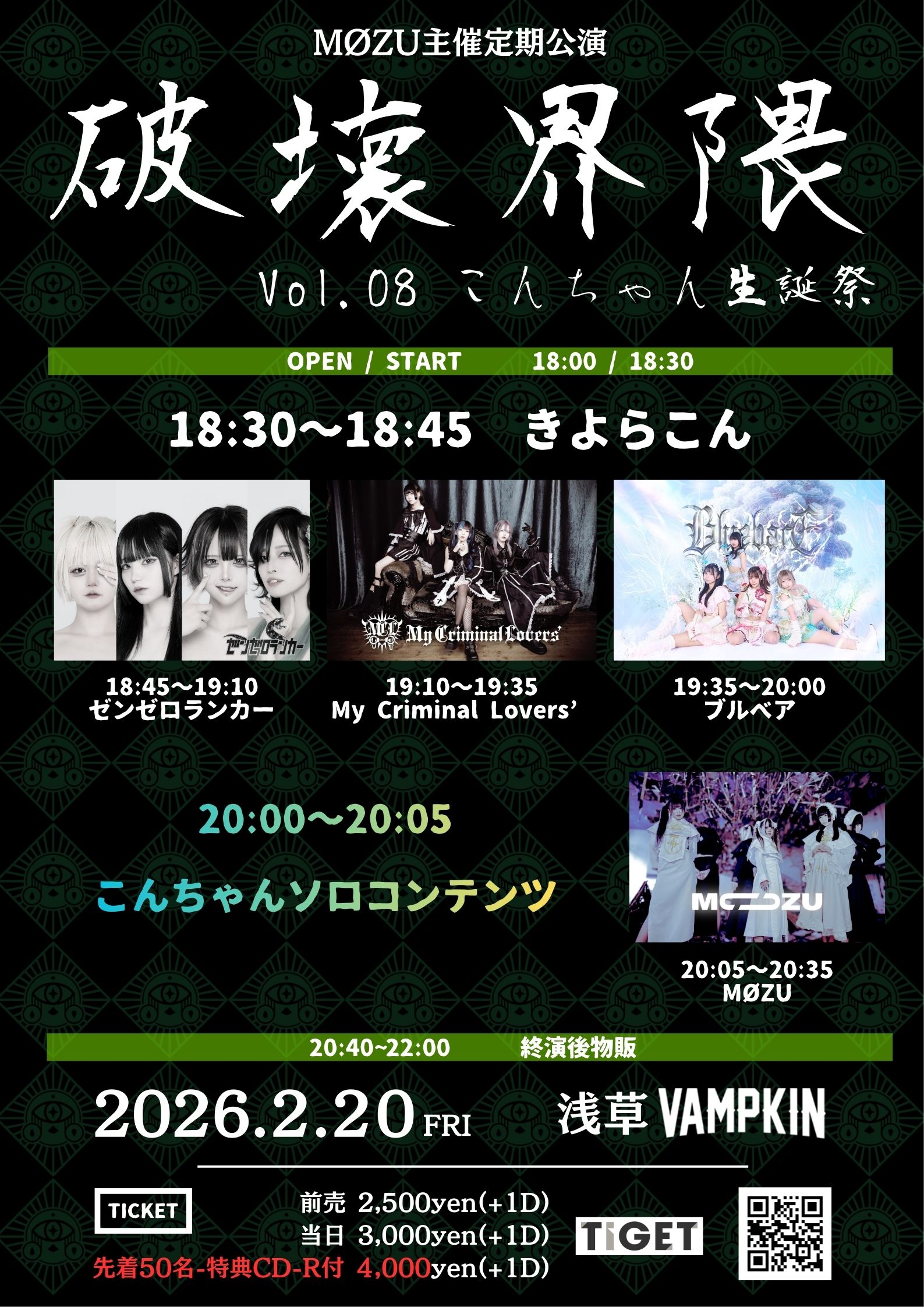 浅草 VAMPKIN スケジュール 2026.2.20(Fri) MØZU主催定期 ”破壊界隈” Vol.8 ~こんちゃん生誕祭~ [ACT] きよらこん ゼンゼロランカー My Criminal Lovers' ブルベア こんちゃんソロ MØZU [OPEN/START] 18:00/18:30 [料金] 前売先着50名:¥4,000- CD付き 前売り一般:¥2,500- 当日:¥3,000- https://tiget.net/events/465946