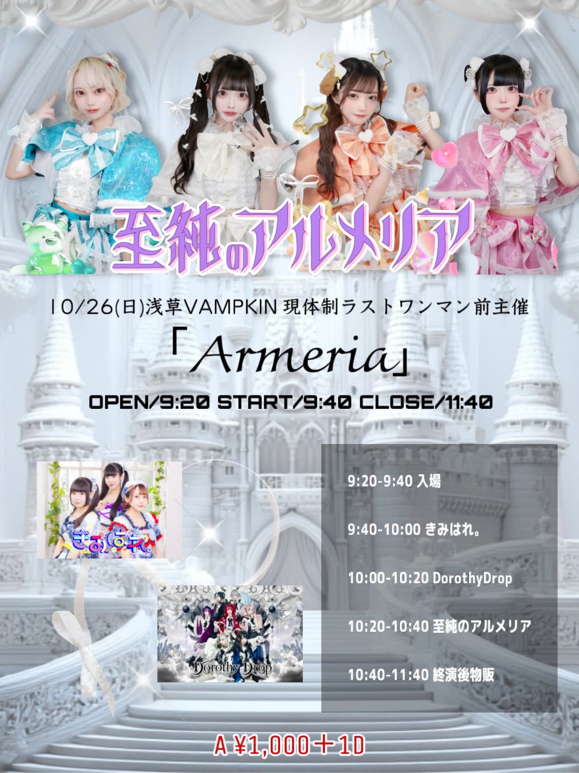 浅草 VAMPKIN スケジュール 2025.10.26(Sun) Armeria [ACT] 至純のアルメリア , DorothyDrop , きみはれ。 [OPEN/START] OPEN 09:20 開演日時 09:40 [料金] ¥1,000+1D https://t.livepocket.jp/e/qg2-v