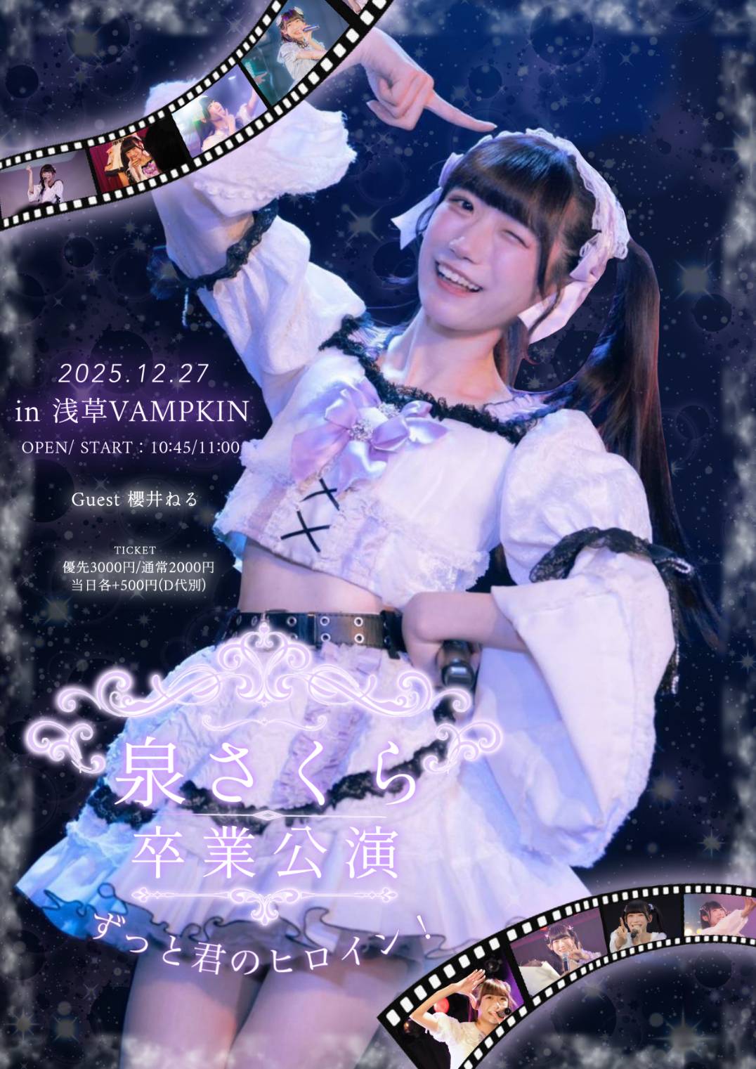 浅草 VAMPKIN スケジュール 2025.12.27(Sat) 泉さくら卒業公演〜ずっと君のヒロイン!〜 [ACT] KATACOTO*BANK、櫻井ねる(ゲスト) [OPEN/START] 10:45/11:00 [料金] 優先3000円/通常2000円/当日各+500円(D代別) https://livepocket.jp/e/sakura-last1227 ①優先整理番号順②通常整理番号順③当日整列順 ・声出し可能公演 ・飲酒禁止、酒気帯びでの入場はお断り。