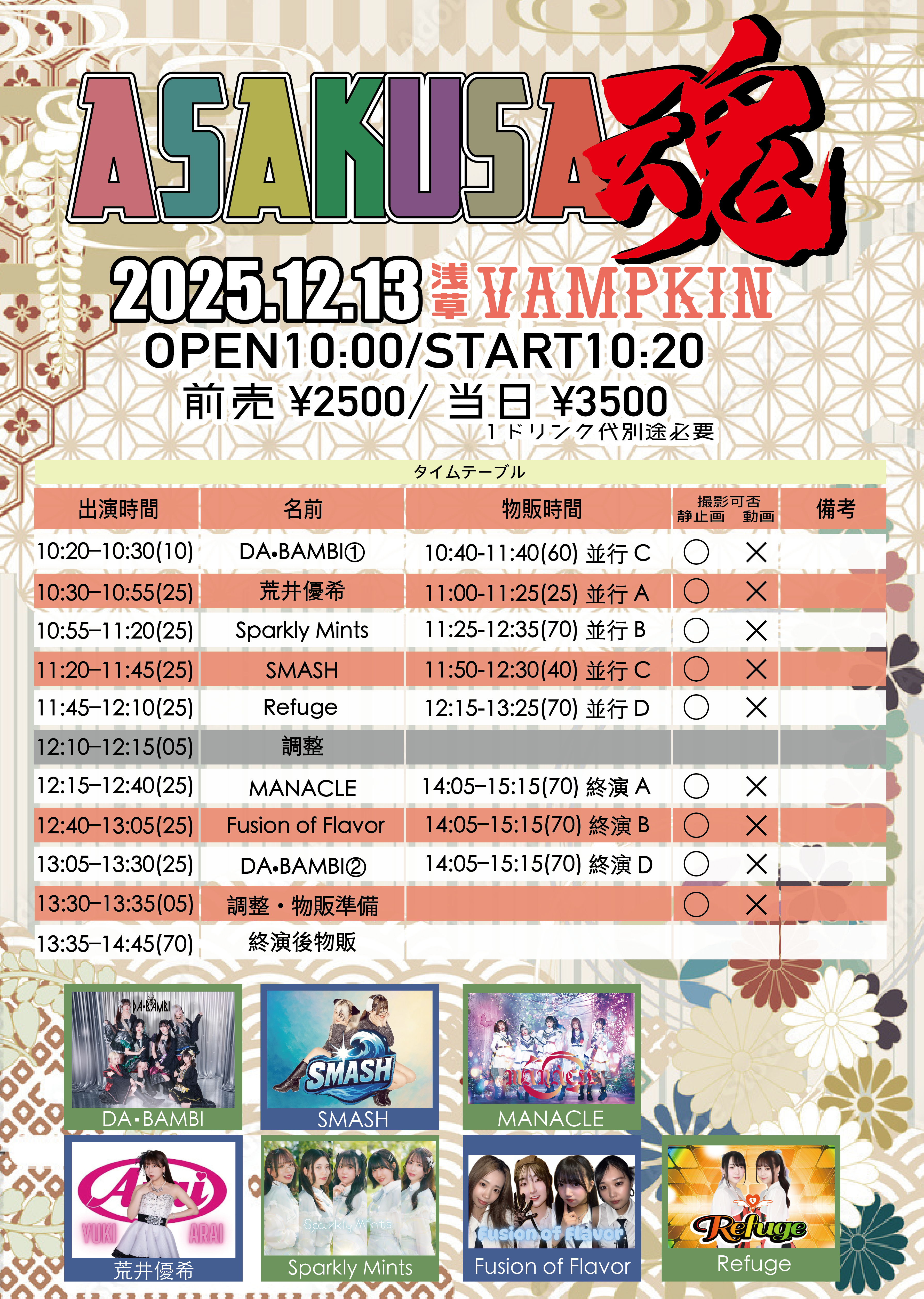 浅草 VAMPKIN スケジュール 2025.12.13(Sat) ASAKUSA魂 [ACT] DA・BAMBI/SMASH/MANACLE/荒井優希/Sparkly Mints/Fusion of Flavor/Refuge [OPEN/START] op10:00/st10:20予定 [料金] 前売¥2500/当日¥3500 https://livepocket.jp/e/tamashii2025